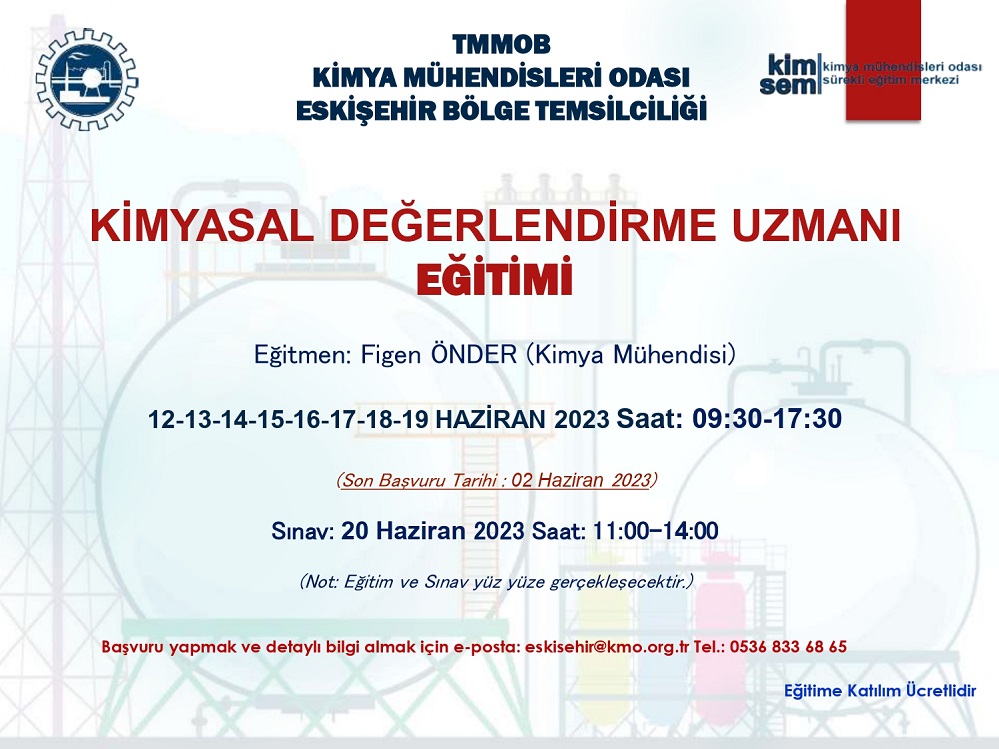 TMMOB Kimya Mühendisleri Odası Eskişehir Bölge Temsilciliği olarak, T.C. Çevre ve Şehircilik Bakanlığı tarafından 23 Haziran 2017 tarih ve 30105 (Mükerrer) sayılı Resmi Gazete` de yayımlanmış olan "Kimyasalların Kaydı, Değerlendirilmesi, İzni ve Kısıtlanması (KKDİK) Hakkında Yönetmeliği" kapsamında 12-13-14-15-16-17-18-19 HAZİRAN 2023 tarihlerinde KİMYASAL DEĞERLENDİRME UZMANI (KDU) EĞİTİMİ programlanmıştır.