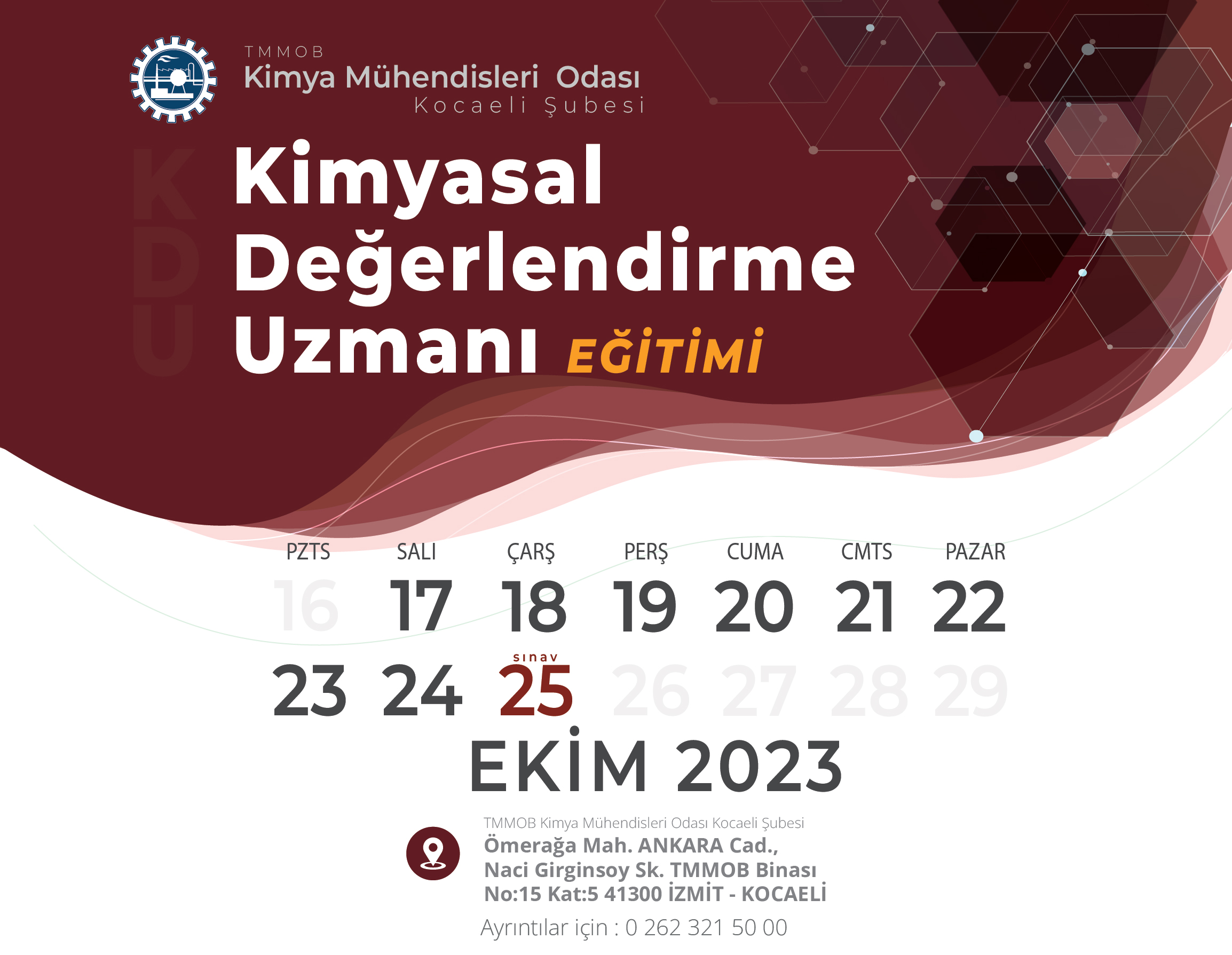 Şubemiz tarafından, T.C. Çevre ve Şehircilik Bakanlığı tarafından 23 Haziran 2017 tarih ve 30105 (Mükerrer) sayılı Resmi Gazete` de yayımlanmış olan "Kimyasalların Kaydı, Değerlendirilmesi, İzni ve Kısıtlanması (KKDİK) Hakkında Yönetmeliği" kapsamında 17-18-19-20-21-22-23-24 Ekim 2023 tarihlerinde KİMYASAL DEĞERLENDİRME UZMANI (KDU) EĞİTİMİ programlanmıştır.