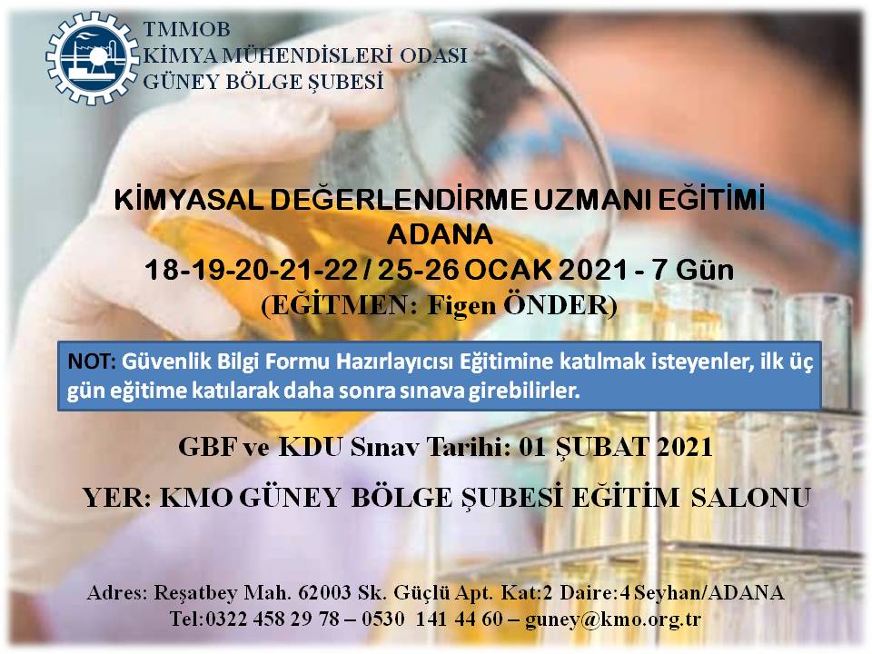 T.C. Çevre ve Şehircilik Bakanlığı tarafından 23 Haziran 2017 tarih ve 30105 (Mükerrer) sayılı Resmi Gazete`de yayımlanmış olan Kimyasalların Kaydı, Değerlendirilmesi, İzni ve Kısıtlanması (KKDİK) Hakkında Yönetmelik` kapsamında şubemiz eğitim salonunda 18-22/25-26 Ocak 2021 tarihleri arasında KİMYASAL DEĞERLENDİRME UZMANI (KDU) EĞİTİMİ düzenlenecektir.