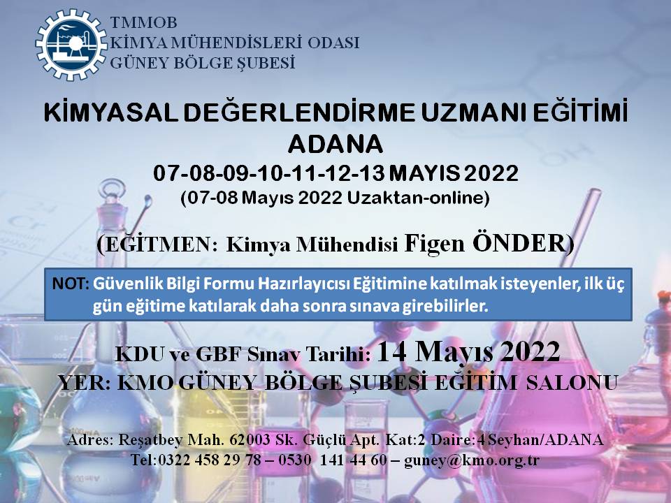 T.C. Çevre ve Şehircilik Bakanlığı tarafından 23 Haziran 2017 tarih ve 30105 (Mükerrer) sayılı Resmi Gazete`de yayımlanmış olan "Kimyasalların Kaydı, Değerlendirilmesi, İzni ve Kısıtlanması (KKDİK) Hakkında Yönetmelik" kapsamında şubemiz eğitim salonunda 07-08-09-10-11-12-13 Mayıs 2022 tarihlerinde yedi gün (07-08 Mayıs 2022 uzaktan-online) KİMYASAL DEĞERLENDİRME UZMANI (KDU) EĞİTİMİ düzenlenecektir.