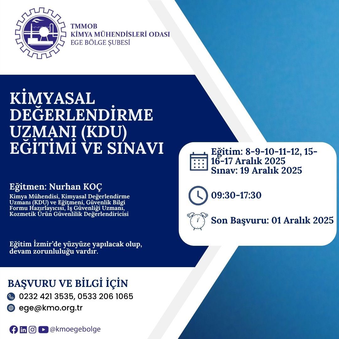 TMMOB Kimya Mühendisleri Odası Ege Bölge Şubesi olarak, T.C. Çevre ve Şehircilik Bakanlığı tarafından 23 Haziran 2017 tarih ve 30105 (Mükerrer) sayılı Resmi Gazete` de yayımlanmış olan "Kimyasalların Kaydı, Değerlendirilmesi, İzni ve Kısıtlanması (KKDİK) Hakkında Yönetmeliği" kapsamında 8-9-10-11-12, 15-16-17 ARALIK 2025 tarihlerinde KİMYASAL DEĞERLENDİRME UZMANI (KDU) EĞİTİMİ programlanmıştır.