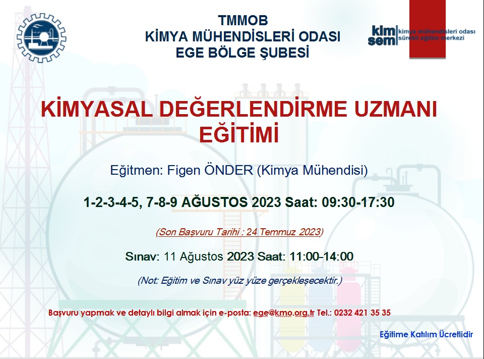 TMMOB Kimya Mühendisleri Odası Ege Bölge Şubesi olarak, T.C. Çevre ve Şehircilik Bakanlığı tarafından 23 Haziran 2017 tarih ve 30105 (Mükerrer) sayılı Resmi Gazete` de yayımlanmış olan "Kimyasalların Kaydı, Değerlendirilmesi, İzni ve Kısıtlanması (KKDİK) Hakkında Yönetmeliği" kapsamında 1-2-3-4-5, 7-8-9 AĞUSTOS 2023 tarihlerinde KİMYASAL DEĞERLENDİRME UZMANI (KDU) EĞİTİMİ programlanmıştır.