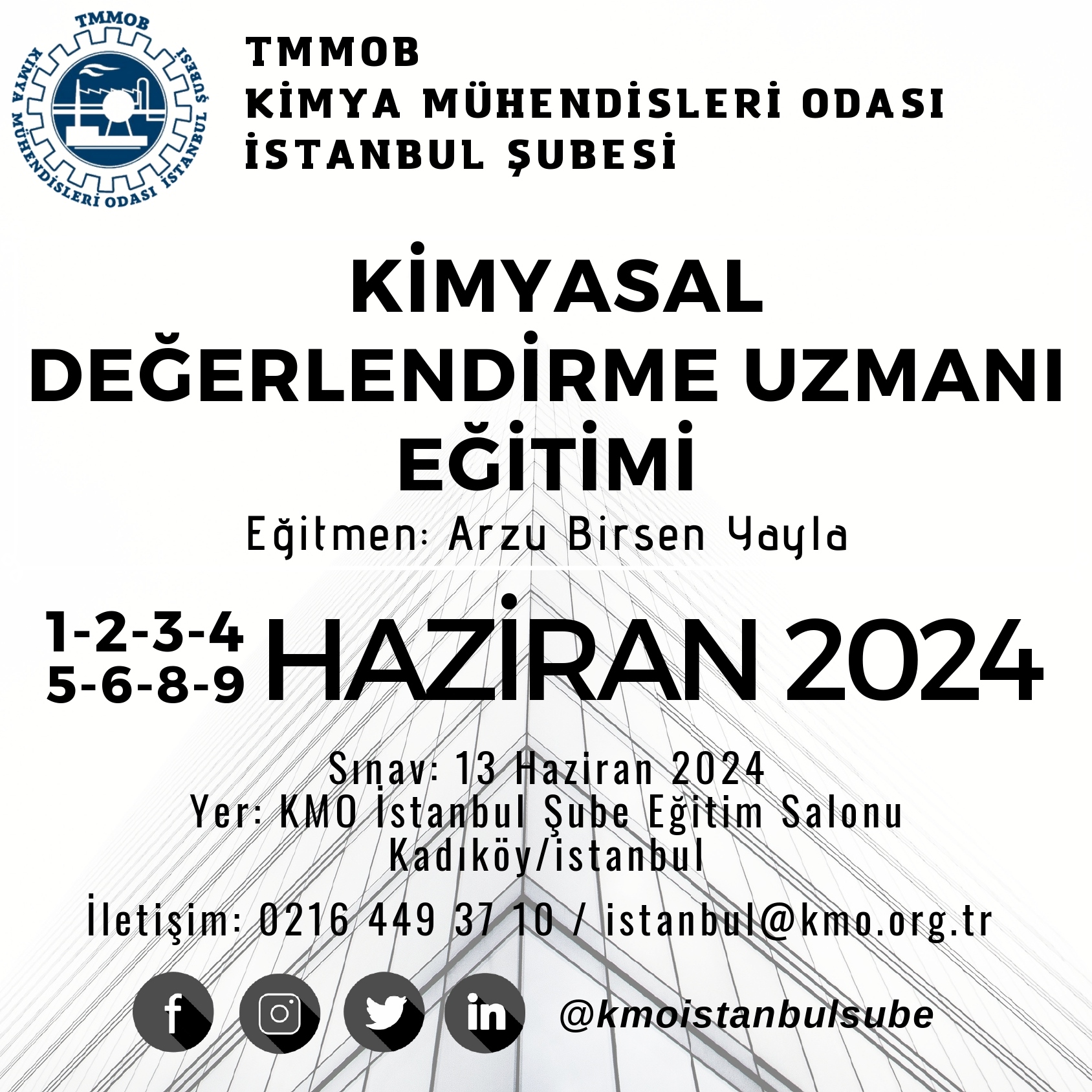 Şubemiz tarafından, T.C. Çevre ve Şehircilik Bakanlığı tarafından 23 Haziran 2017 tarih ve 30105 (Mükerrer) sayılı Resmi Gazete`de yayımlanmış olan "Kimyasalların Kaydı, Değerlendirilmesi, İzni ve Kısıtlanması (KKDİK) Hakkında Yönetmeliği" kapsamında 1-2-3-4-5-6-8-9 Haziran 2024 tarihlerinde KİMYASAL DEĞERLENDİRME UZMANI (KDU) EĞİTİMİ programlanmıştır. Eğitimimize katılım kontenjanı 18 ile sınırlı olup son başvuru tarihi 24 Mayıs 2024 tarihidir. Eğitime katılım önceliği başvuru sırasına göre verilecektir.