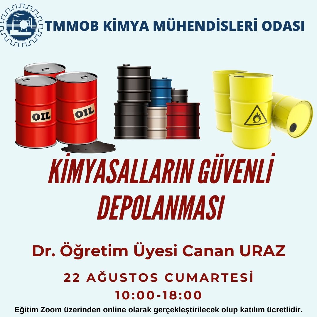 22 Ağustos 2020 tarihinde KİMYASALLARIN GÜVENLİ DEPOLANMASI EĞİTİMİ Zoom programı üzerinden online olarak düzenlenecektir.