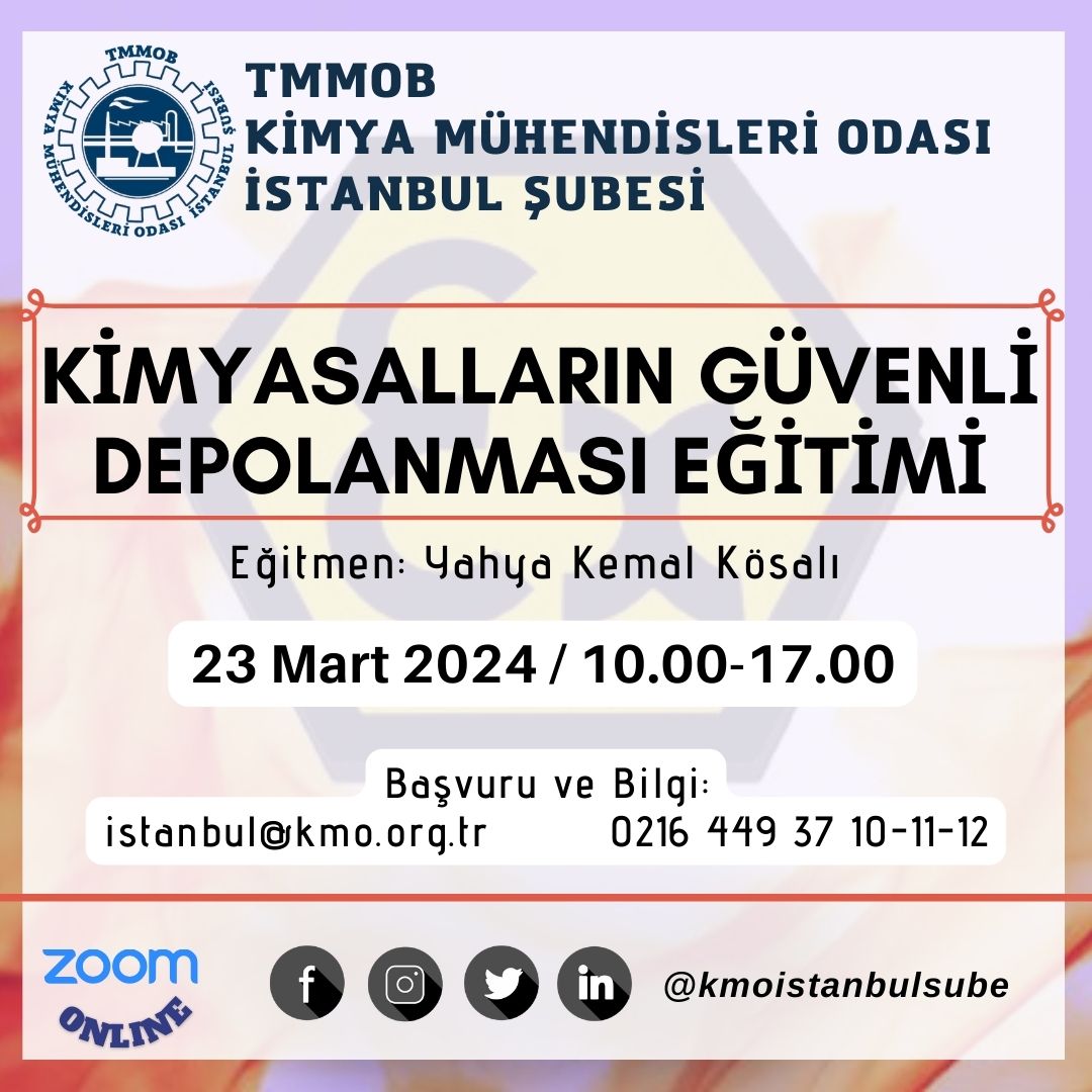 Odamız tarafından, 23 Mart 2024 Cumartesi günü Kimyasalların Güvenli Depolanması Eğitimi online olarak zoom programı üzerinden düzenlenecektir. Eğitim ile ilgili detaylı bilgi aşağıda yer almakta olup eğitim başvuru formunu ekte/dosyalar kısmında bulabilirsiniz. Eğitime katılmak isteyen meslektaşlarımızın başvuru formunu doldurarak 21 Mart 2024 tarihine kadar istanbul@kmo.org.tr e-mail adresine göndermelerini rica ederiz. Kontenjanımız 20 kişiyle sınırlı olup öncelik başvuru sırasına verilecektir.