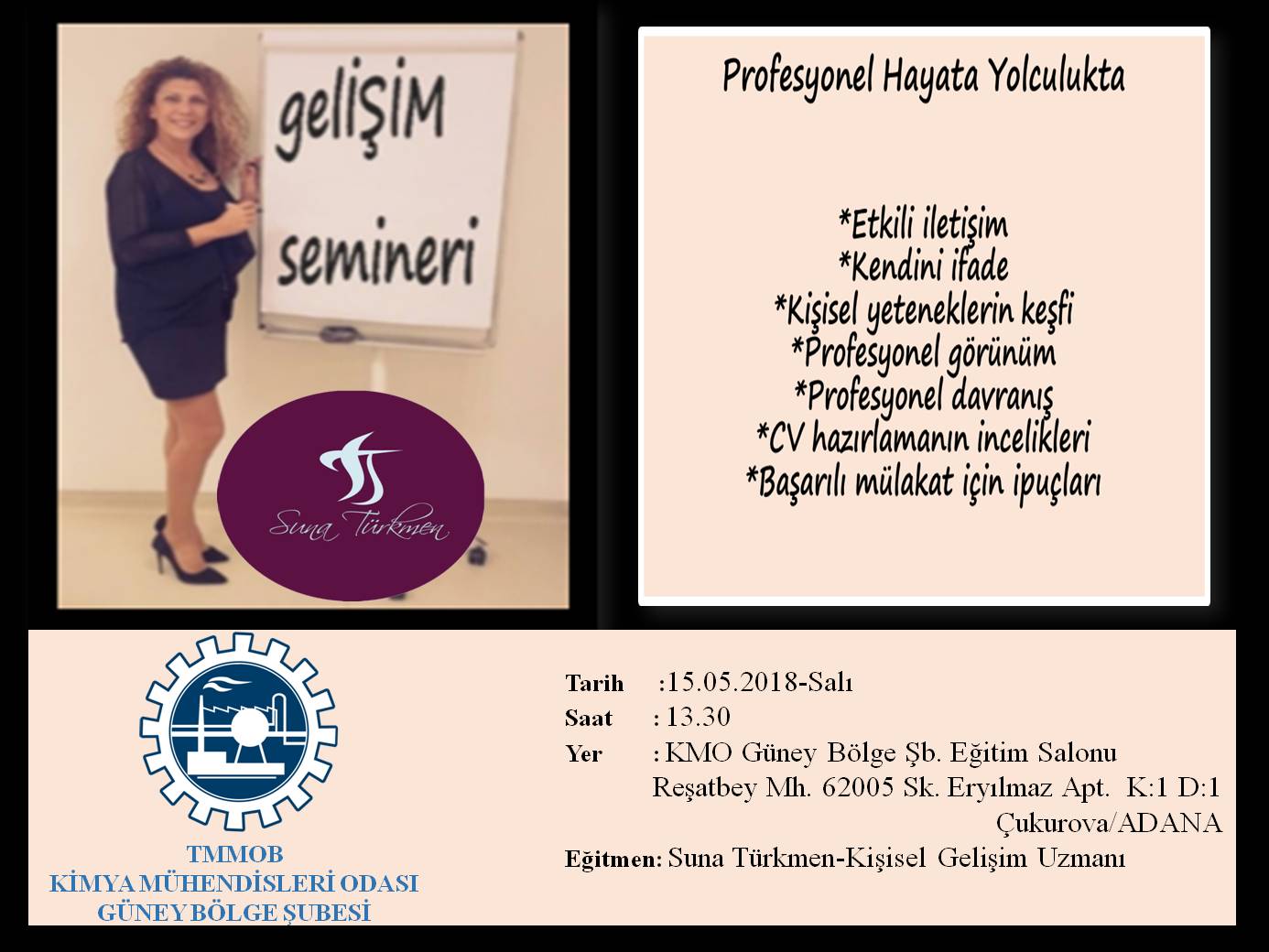 Özellikle yeni mezun,işsiz üyelerimizle öğrencilere yönelik ücretsiz olarak düzenleyeceğimiz Kişisel Gelişim Seminerinde;iş hayatına ilk adımda etkili iletişim, kendini ifade etme, kişisel yeteneklerin keşfi, profesyonel görünüm ve davranış, CV hazırlamanın incelikleri ve başarılı mülakat için ipuçları konuları üzerinde durulacaktır.