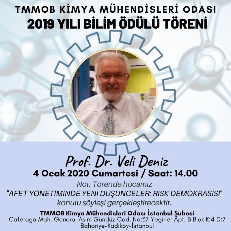 Odamız tarafından her yıl verilen Bilim ve Hizmet Ödülleri sahiplerini buldu. 2019 Bilim Ödülü verilen hocalarımızdan İstanbul Şubemiz üyesi Prof. Dr. Veli DENİZ`in ödül töreni 4 Ocak 2020 tarihinde Şubemizde gerçekleşecektir.