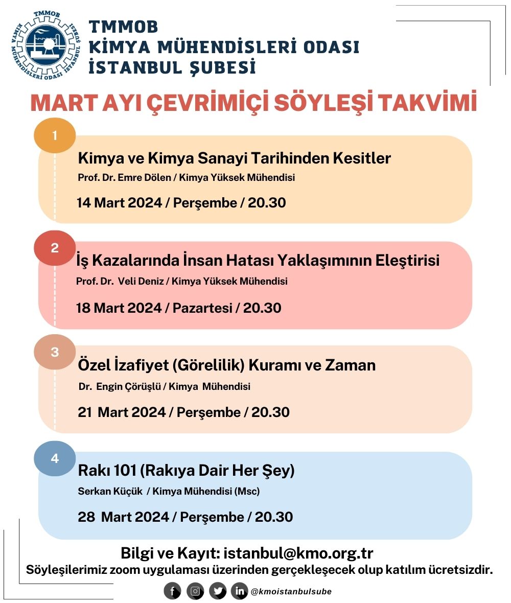 | Kimya ve Kimya Sanayi Tarihinden Kesitler | Prof. Dr. Emre Dölen | 14 Mart 2024 Perşembe / 20:30 | Genel Katılım / Ücretsiz |