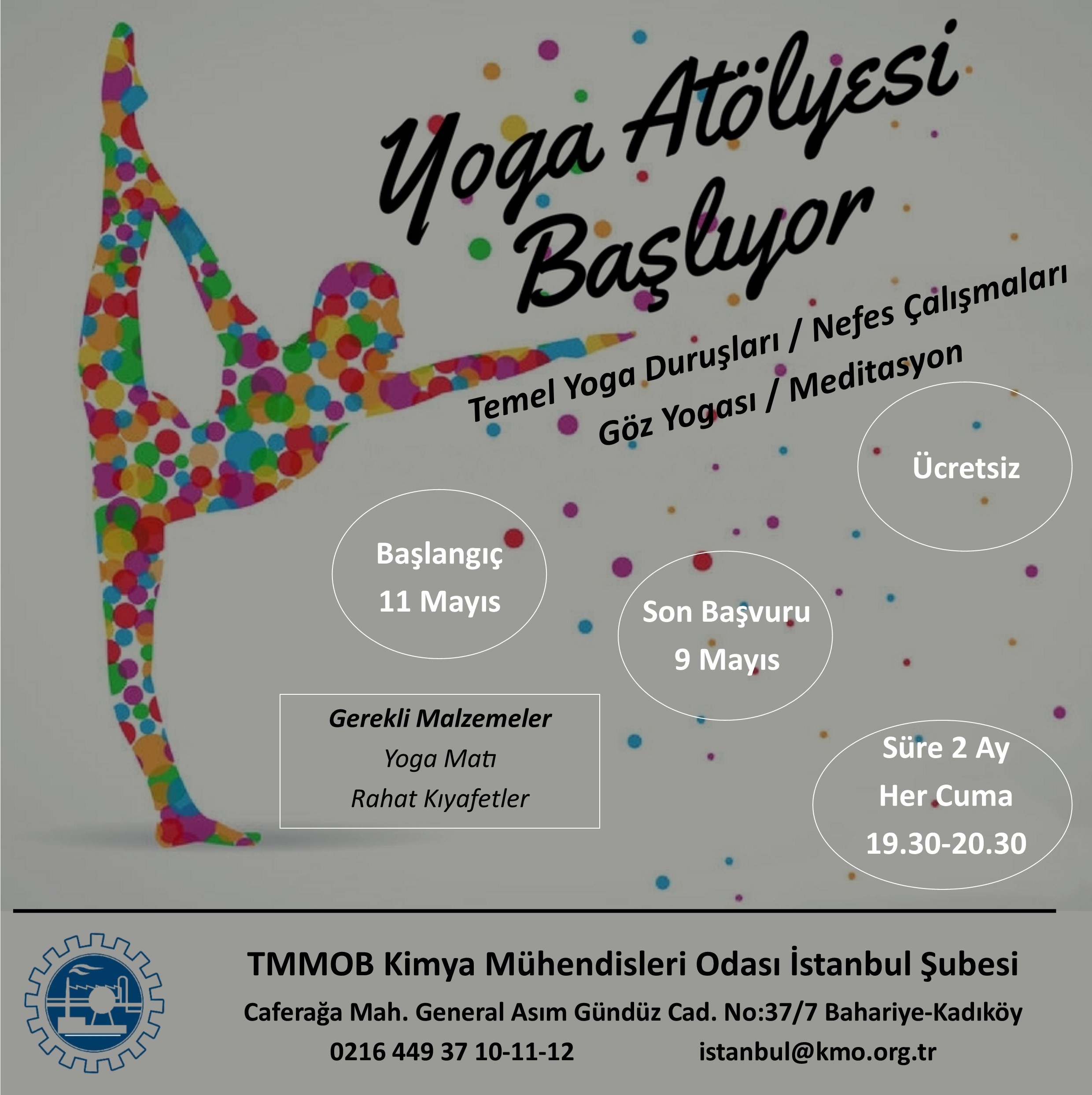 Şubemiz üyesi meslektaşlarımıza ve öğrenci üyelerimize yönelik KMO İstanbul Şube Yoga Atölyesi başlıyor. Atölyemize başvurular 9 Mayıs tarihine kadar alınacak olup, atölyenin 11 Mayıs 2018 tarihinde başlaması planlanmaktadır.