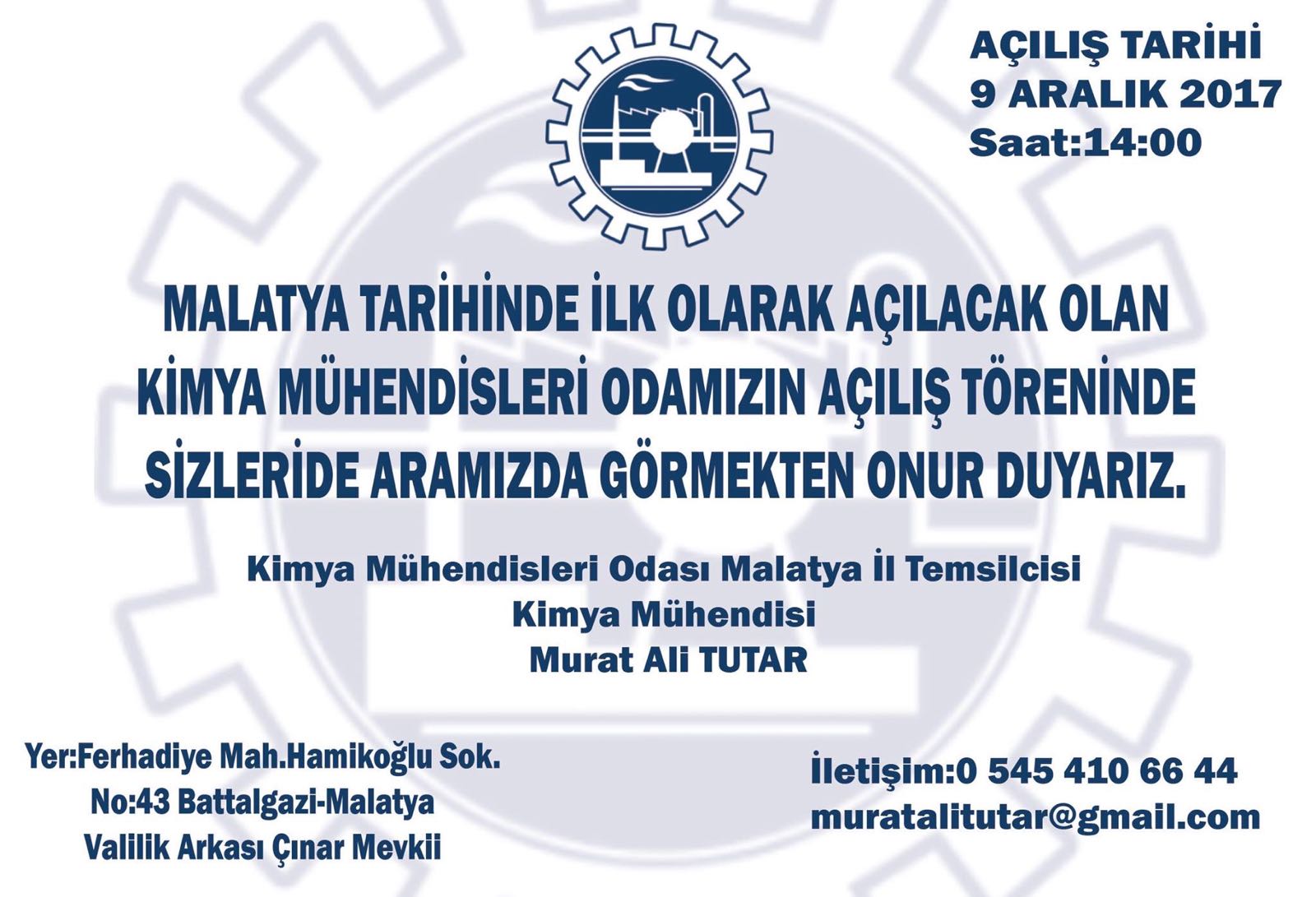 9 Aralık 2017 tarihinde saat 14:00 da Ferhadiye Mahallesi Hamikoğlu Sokak No:43 Battalgazi/Malatya (Valilik arkası, Çınar mevkii) adresinde Şube Başkanımız Sn. Erkin Etike`nin de katılımıyla TMMOB Kimya Mühendisleri Odası Ankara Şubesine bağlı KMO Malatya Temsilciliği açılışı gerçekleştirilecektir. KMO Malatya temsilciliğine atanan Sn. Murat Ali Tutar`a görevinde başarılar dileriz.