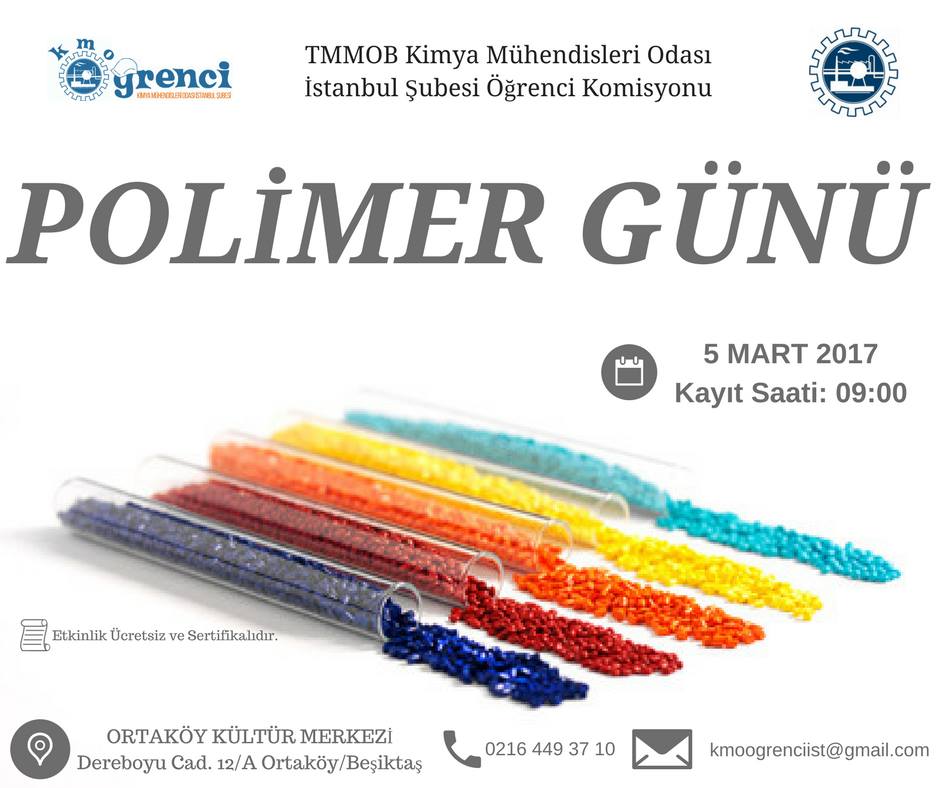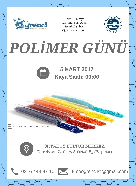 TMMOB Kimya Mühendisliği Odası İstanbul Şubesi Öğrenci Komisyonumuz, 5 Mart 2017 tarihinde Ortaköy Kültür Merkezinde düzenlenecek olan "Polimer Günü" etkinliğimize bütün öğrenci arkadaşlarımızın katılım göstermesini beklemektedir.