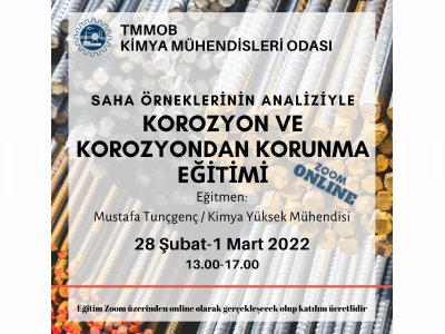 28 Şubat-1 Mart 2022 tarihlerinde "Korozyon ve Korozyondan Korunma Eğitimi (Saha Örneklerinin Analiziyle)" online olarak zoom programı üzerinden düzenlenecektir. Eğitim ile ilgili detaylı bilgi aşağıda yer almakta olup eğitim başvuru formunu ekte dosyalar kısmında bulabilirsiniz. Eğitime katılmak isteyenlerin başvuru formunu doldurarak ege@kmo.org.tr adresine göndermelerini rica ederiz.