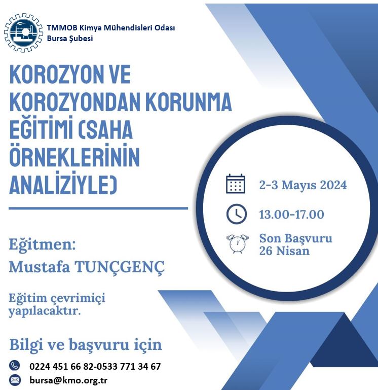 | EĞİTİM İÇERİĞİ | Birinci Gün (4 saat) 1.Korozyonun Tanımı ve Etkileri a. Korozyonun Tanımı b. Ekonomik Etkileri c. Çevresel Etkileri d. Güvenlikle İlgili Etkileri 2. Korozyonun Elektrokimyasal Temelleri a. Korozyon Süreçlerinin Olabilirliği-Termodinamik Bakış b. Yerel Korozyon Pili Oluşumları c. Yerel Pillerde Korozyon Hızını Etkileyen Etmenler d. Polarizasyon, Pasivasyon ve İnhibisyon Kavramları 3. Başlıca Korozyon Biçimleri a. Genel (uniform) Korozyon b. Galvanik Korozyon c. Çukurcuk (Pitting) Korozyonu d. Yarık ya da Çatlak (Crevice) Korozyonu e. Tane Sınırları Korozyonu f. Seçimli Korozyon (Selective Leaching) g. Erozyon Korozyonu h. Gerilimli Korozyon Çatlaması i. Mikrobiyal Korozyon