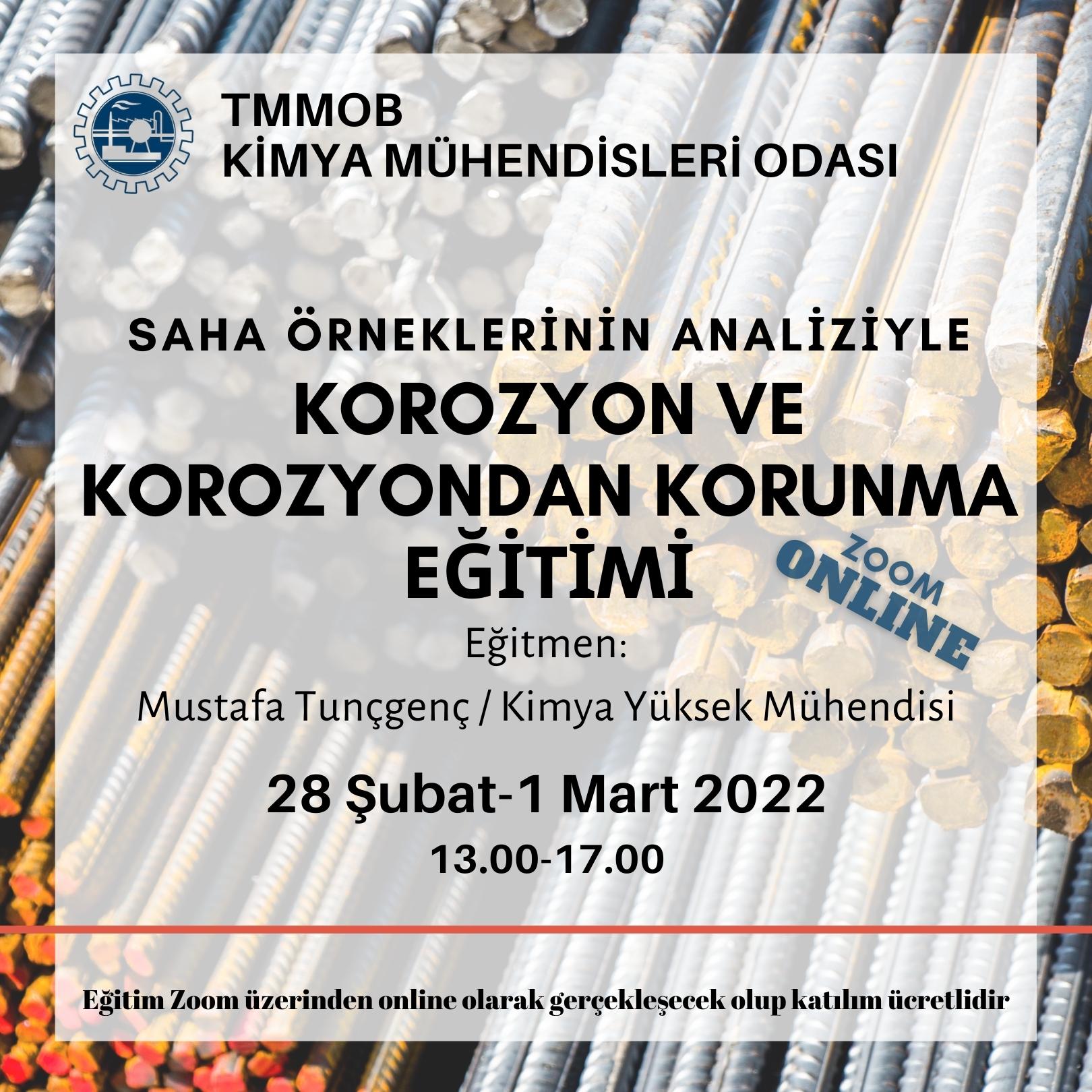 28 Şubat-1 Mart 2022 tarihlerinde "Korozyon Ve Korozyondan Korunma Eğitimi (Saha Örneklerinin Analiziyle)" online olarak zoom programı üzerinde düzenlenecektir. Eğitim ile ilgili detaylı bilgi aşağıda yer almakta olup eğitim başvuru formunu ekte dosyalar kısmında bulabilirsiniz. Eğitime katılmak isteyenlerin başvuru formunu doldurarak guney@kmo.org.tr adresine göndermelerini rica ederiz.