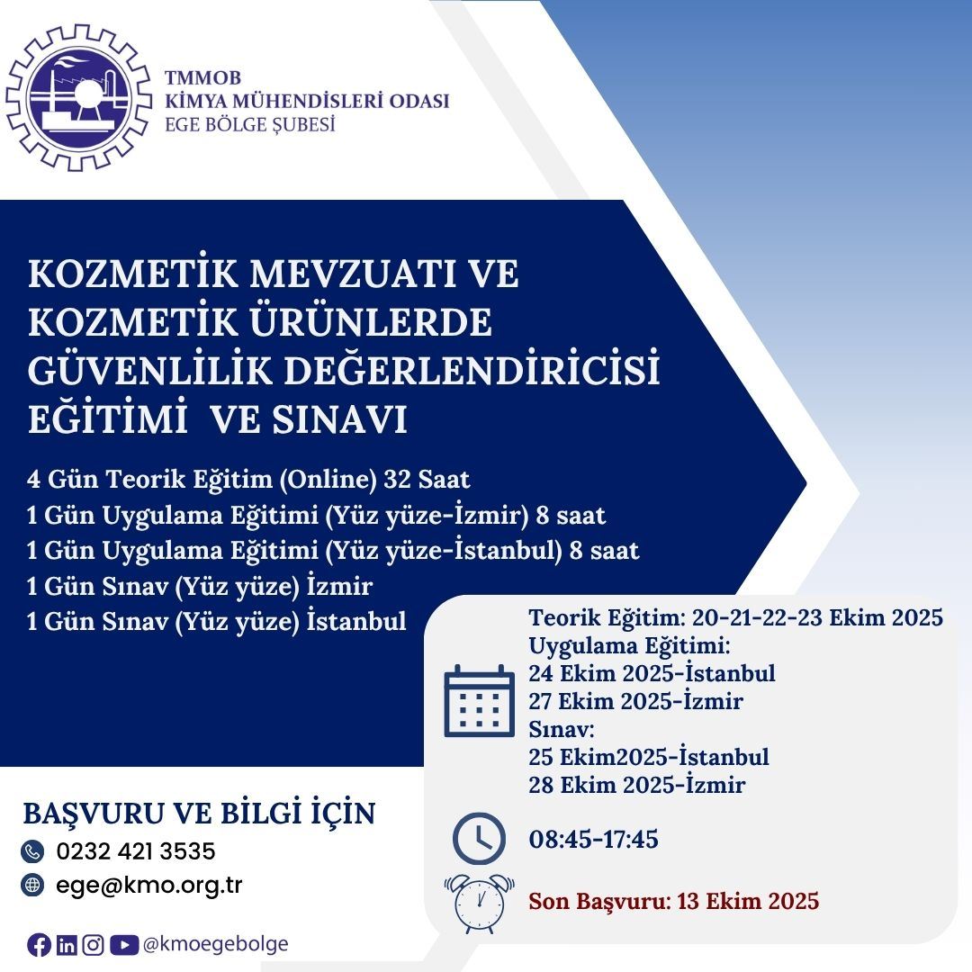 20-21-22-23-24-25, 27-28 EKİM 2025 tarihlerinde, İstinye Üniversitesi Teknoloji Araştırma Geliştirme İnovasyon ve Danışmanlık A.Ş. bünyesinde, Kimya Mühendisleri Odası işbirliği ile, "KOZMETİK MEVZUATI VE KOZMETİK ÜRÜNLERDE GÜVENLİLİK DEĞERLENDİRİCİSİ EĞİTİMİ" düzenlenecektir. Eğitim ile ilgili detaylı bilgi aşağıda yer almakta olup eğitim başvuru formunu ekte bulabilirsiniz. Son başvuru tarihi 13 EKİM 2025 olup, eğitime katılmak isteyenlerin, başvuru formunu doldurarak ege@kmo.org.tr e-posta adresine göndermelerini rica ederiz.