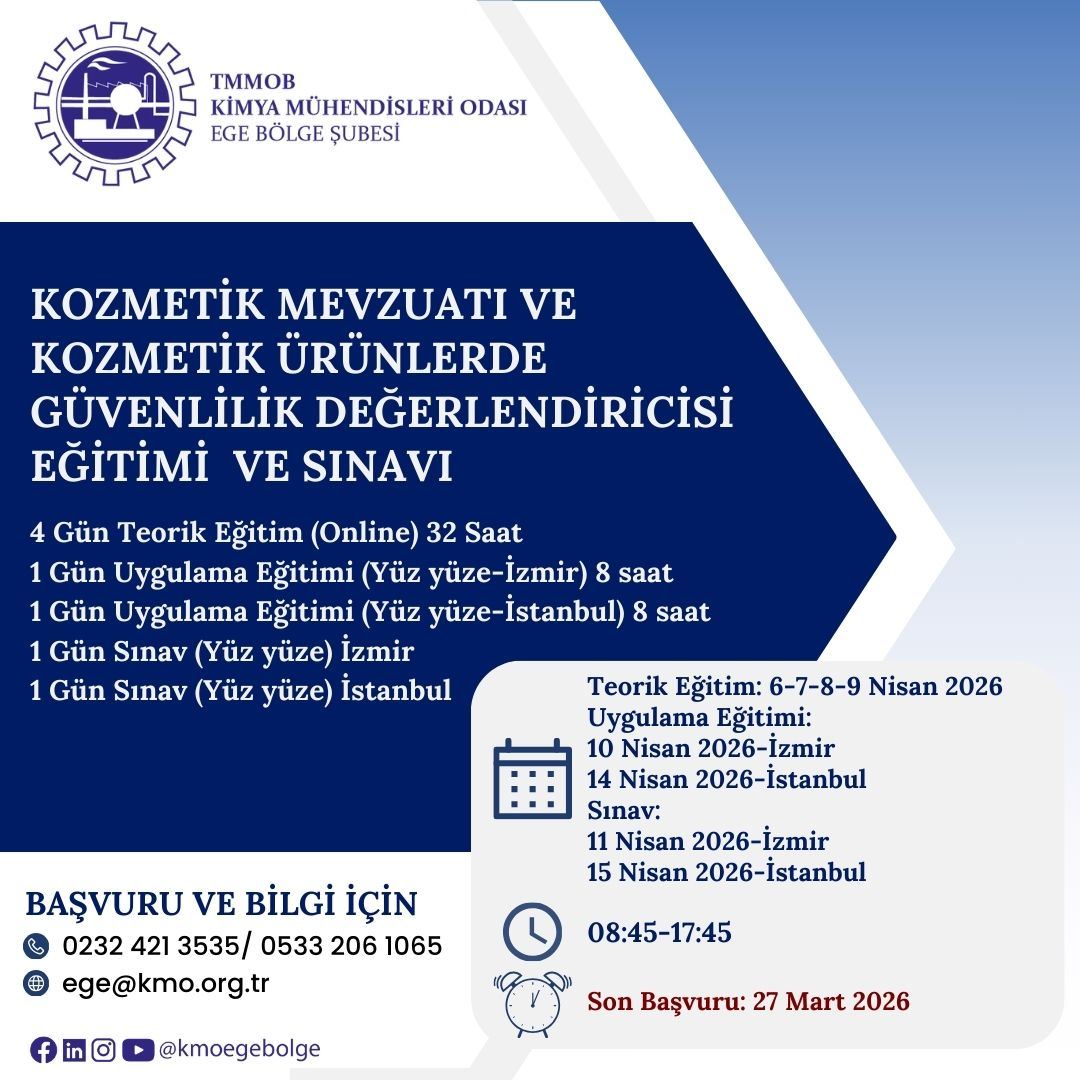 6-7-8-9-10-11, 14-15 Nisan 2026 tarihlerinde, İstinye Üniversitesi Teknoloji Araştırma Geliştirme İnovasyon ve Danışmanlık A.Ş. bünyesinde, Kimya Mühendisleri Odası işbirliği ile, "KOZMETİK MEVZUATI VE KOZMETİK ÜRÜNLERDE GÜVENLİLİK DEĞERLENDİRİCİSİ EĞİTİMİ" düzenlenecektir. Eğitim ile ilgili detaylı bilgi aşağıda yer almakta olup eğitim başvuru formunu aşağıda/ekte bulabilirsiniz. Son başvuru tarihi 27 Mart 2026 olup, eğitime katılmak isteyenlerin, başvuru formunu doldurarak ege@kmo.org.tr e-posta adresine göndermelerini rica ederiz.