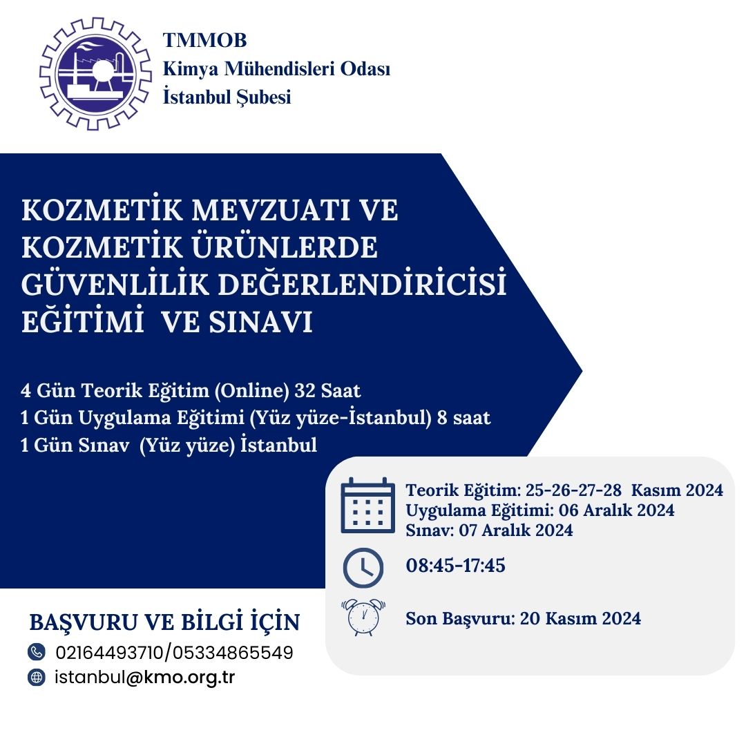 25-26-27-28 Kasım/ 6-7 Aralık 2024 tarihlerinde, İstinye Üniversitesi Teknoloji Araştırma Geliştirme İnovasyon ve Danışmanlık A.Ş. bünyesinde, Kimya Mühendisleri Odası işbirliği ile, "Kozmetik Mevzuatı ve Kozmetik Ürünlerde Güvenlilik Değerlendiricisi Eğitimi" düzenlenecektir. Eğitim ile ilgili detaylı bilgi aşağıda yer almakta olup eğitim başvuru formunu ekte bulabilirsiniz. Son başvuru tarihi 20 Kasım 2024 olup, eğitime katılmak isteyenlerin, başvuru formunu doldurarak istanbul@kmo.org.tr e-posta adresine göndermelerini rica ederiz.