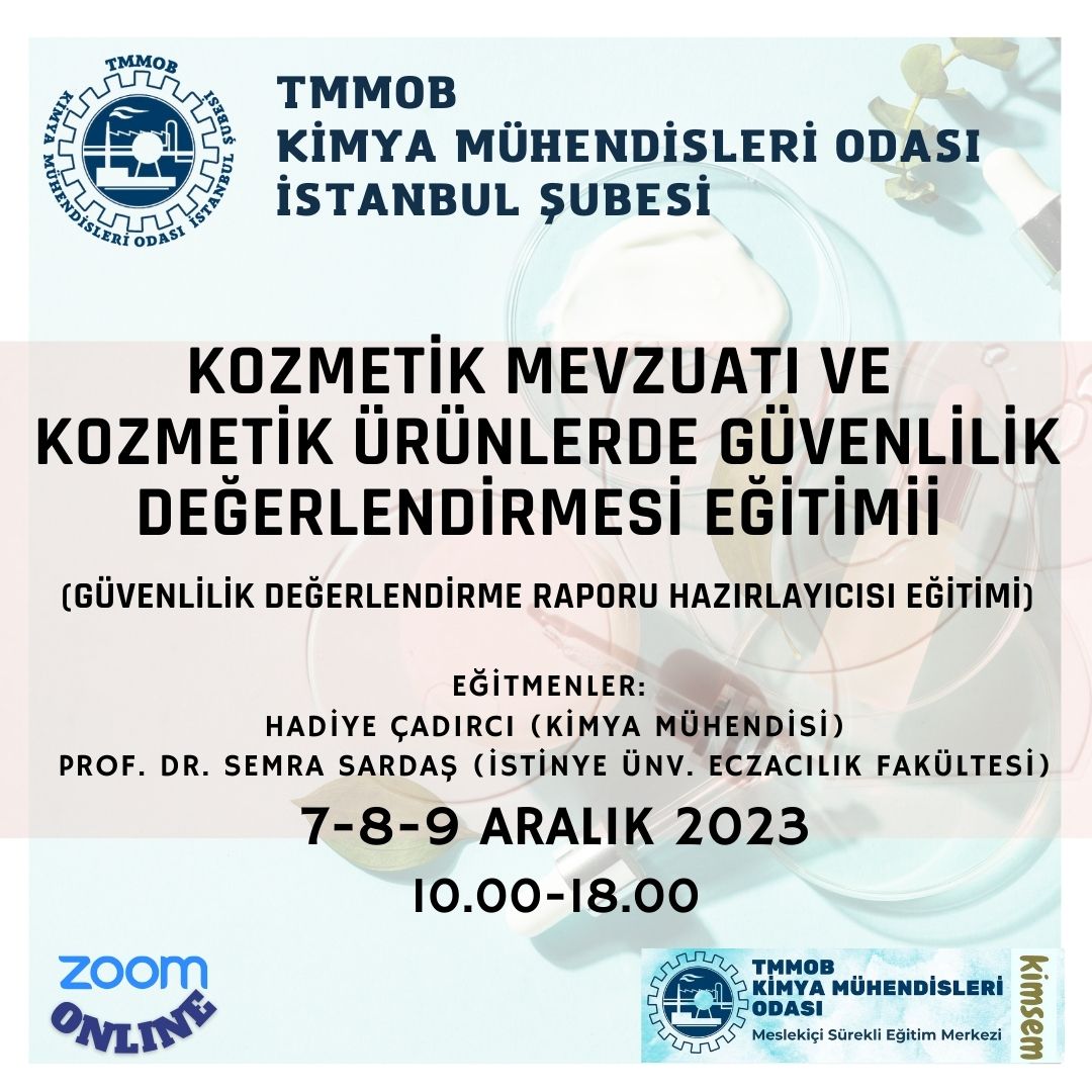 Şubemiz tarafından 7-8-9 Aralık 2023 tarihlerinde Kozmetik Mevzuatı ve Kozmetik Ürünlerde Güvenlilik Değerlendirmesi Eğitimi (Güvenlilik Değerlendirme Raporu Hazırlayıcısı Eğitimi) online olarak zoom programı üzerinden düzenlenecektir.