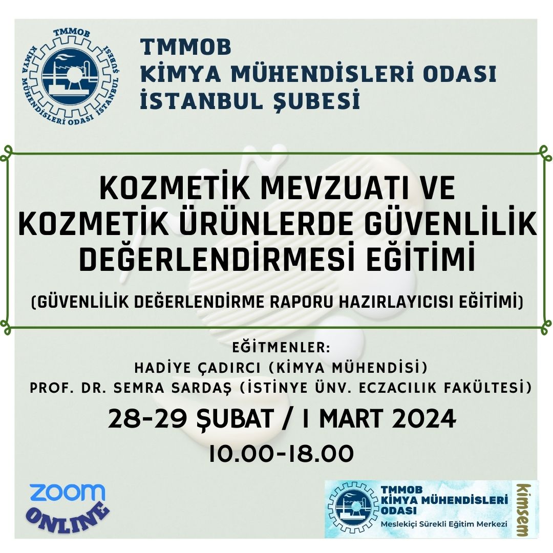 Şubemiz tarafından 28-29 Şubat- 1 Mart 2024 tarihlerinde Kozmetik Mevzuatı ve Kozmetik Ürünlerde Güvenlilik Değerlendirmesi Eğitimi (Güvenlilik Değerlendirme Raporu Hazırlayıcısı Eğitimi) online olarak zoom programı üzerinden düzenlenecektir.