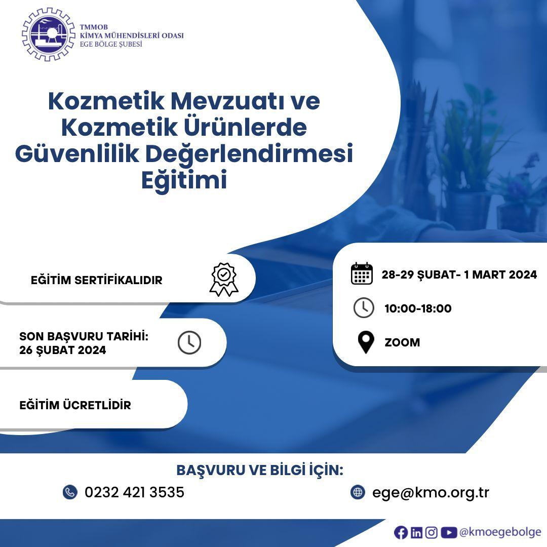 Kimya Mühendisleri Odası tarafından 28-29 Şubat- 1 Mart 2024 tarihlerinde Kozmetik Mevzuatı ve Kozmetik Ürünlerde Güvenlilik Değerlendirmesi Eğitimi (Güvenlilik Değerlendirme Raporu Hazırlayıcısı Eğitimi) online olarak zoom programı üzerinden düzenlenecektir. Eğitim ile ilgili detaylı bilgi aşağıda yer almakta olup eğitim başvuru formunu ekte/dosyalar kısmında bulabilirsiniz. Eğitime katılmak isteyenlerin, başvuru formunu doldurarak 26 Şubat 2024 tarihine kadar ege@kmo.org.tr adresine göndermelerini rica ederiz.