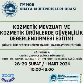 | KATILIMCILARDA ARANACAK ŞARTLAR (EĞİTİME KİMLER KATILMALI) | Kozmetik ürün üreten, ürettiren, ihraç veya ithal eden işyerlerinde, üretim, laboratuvar, AR&GE, kalite kontrol, kalite yönetim, ürün güvenliği vb. alanlarda görev yapan Kimya Mühendisi, Kimyager ve diğer teknik personel ile bu işyerlerinde Sorumlu Yönetici, Ürün Güvenlik Değerlendirme Sorumlusu/Uzmanı olarak görev yapan kişiler ile bu alanlarda görev yapmayı hedefleyen ilgili uzmanlar |