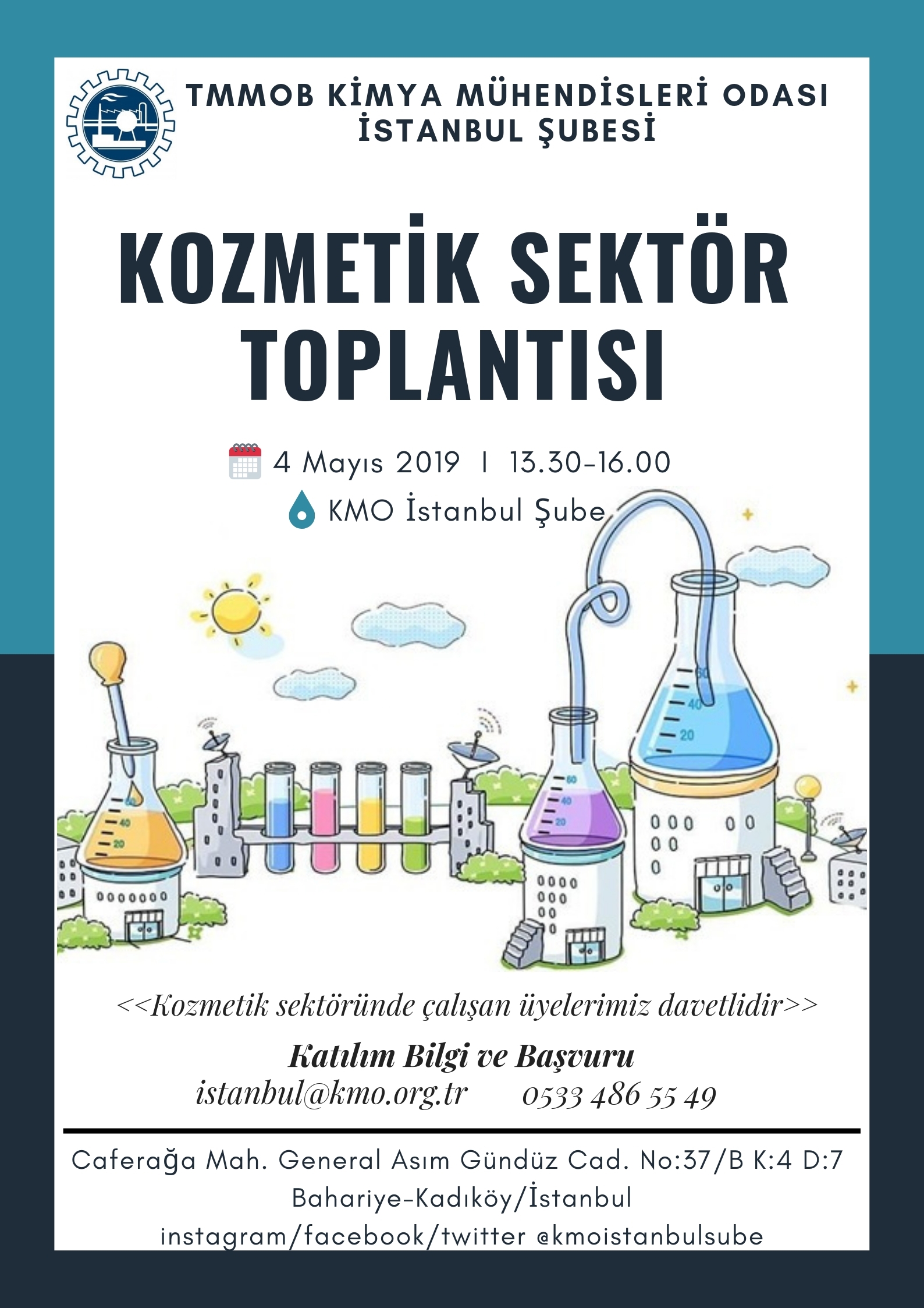 Kozmetik sektör sorunları ve Kimya Mühendislerinin sektördeki yerini değerlendirmek amacıyla 4 Mayıs 2019 Cumartesi günü, 13.30-16:00 saatleri arası şubemiz eğitim salonunda Kozmetik Komisyonu toplantısı yapılacaktır.