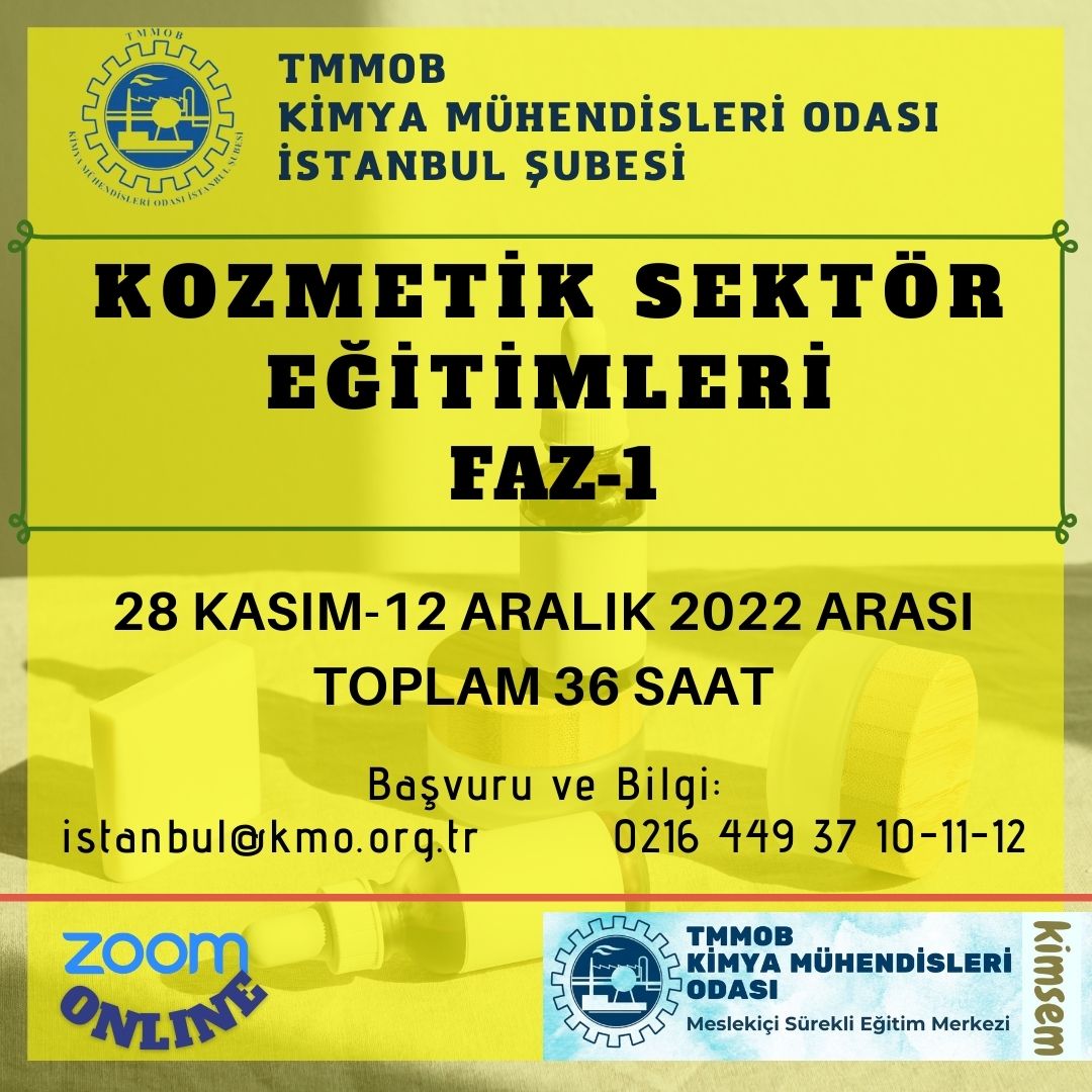 28 Kasım-12 Aralık 2022 tarihlerinde Kozmetik Sektörü Eğitimleri (Faz 1) zoom programı üzerinden düzenlenecektir. Eğitimler ile ilgili detaylı bilgi aşağıda yer almakta olup eğitim başvuru formunu ekte bulabilirsiniz. Eğitime katılmak isteyenlerin, başvuru formunu doldurarak 23 Kasım 2022 tarihine kadar istanbul@kmo.org.tr e-posta adresine göndermelerini rica ederiz.