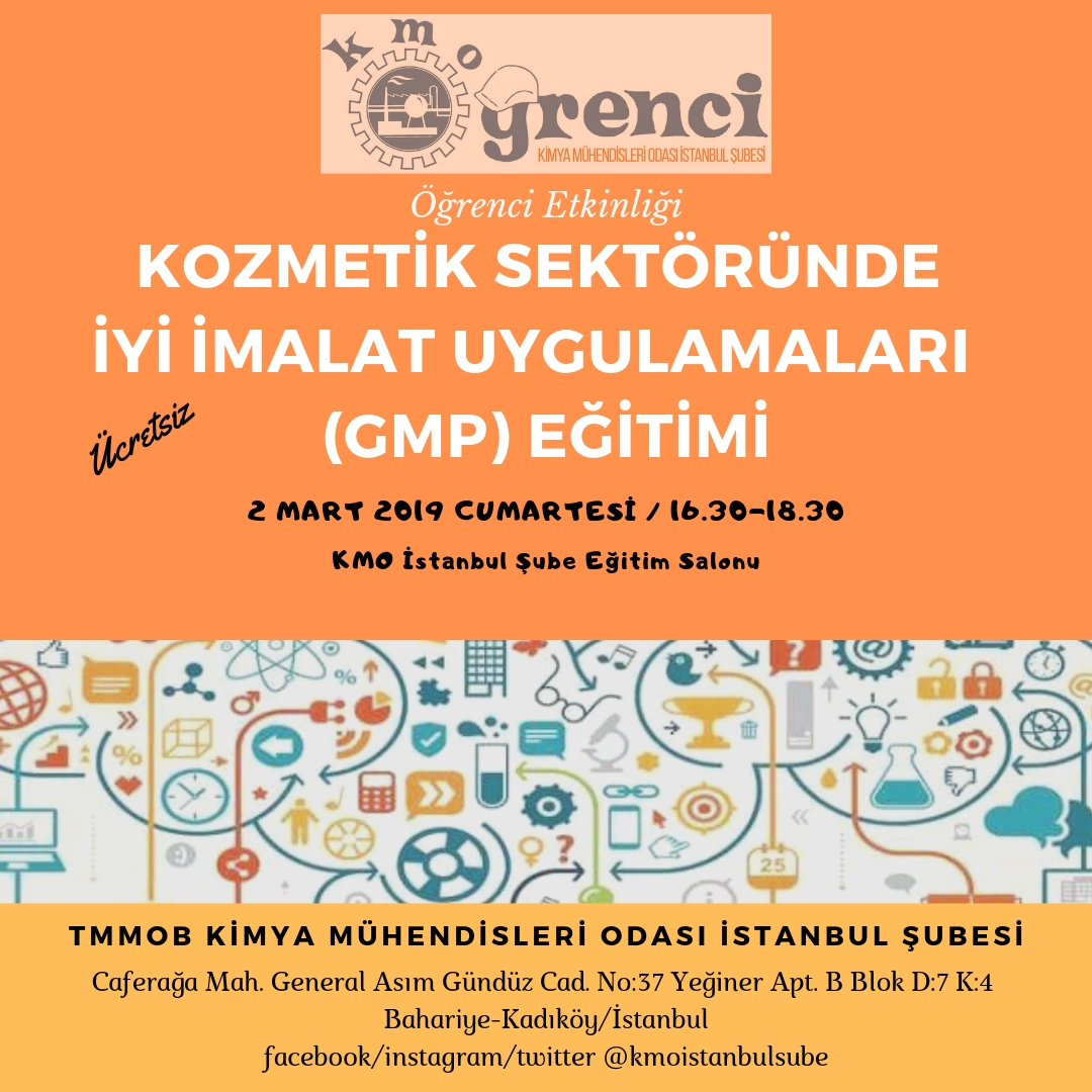 2 Mart 2019 Cumartesi günü, saat:16.30-18.30 arasında öğrenci komisyonumuz üyelerine ve çalışmayan mezun üyelerimize yönelik ücretsiz olarak `Kozmetik Sektöründe İyi İmalat Uygulamaları (GMP) Eğitimi" gerçekleşecektir.