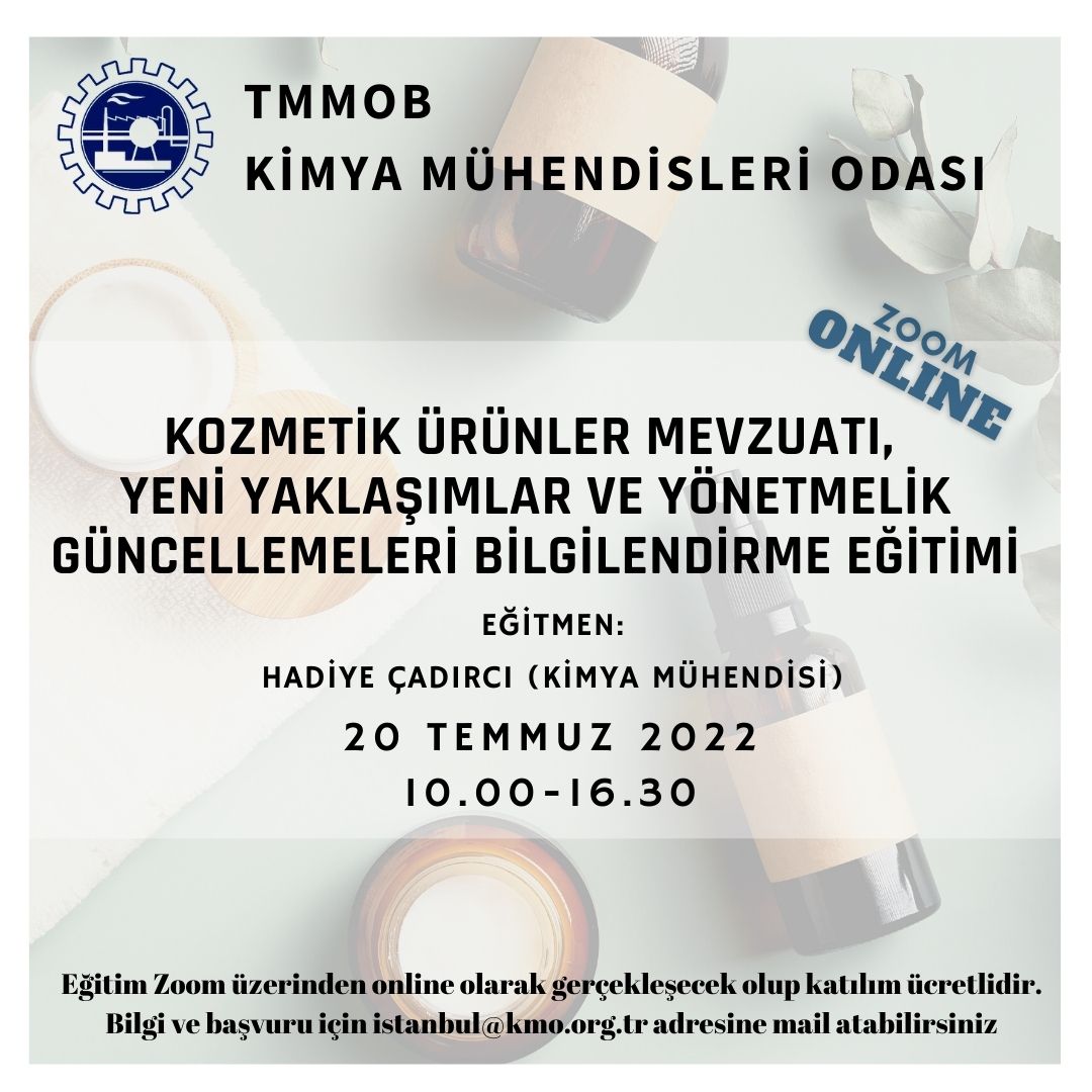 20 Temmuz 2022 tarihinde 10.00-16.30 saatleri arasında düzenleyeceğimiz "Kozmetik Ürünler Mevzuatı, Yeni Yaklaşımlar ve Yönetmelik Güncellemeleri Bilgilendirme Eğitimi" Zoom programı üzerinden online olarak gerçekleşecektir.
