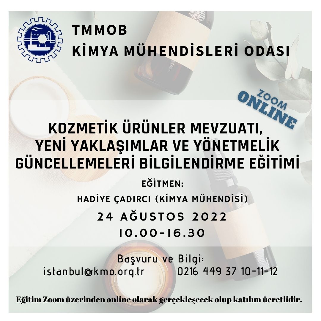 24 Ağustos 2022 tarihinde 10.00-16.30 saatleri arasında düzenleyeceğimiz `Kozmetik Ürünler Mevzuatı, Yeni Yaklaşımlar ve Yönetmelik Güncellemeleri Bilgilendirme Eğitimi` zoom programı üzerinden online olarak gerçekleşecektir.