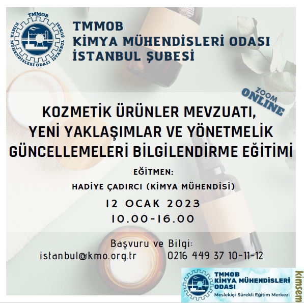 12 Ocak 2023 tarihinde 10.00-16.30 saatleri arasında `Kozmetik Ürünler Mevzuatı, Yeni Yaklaşımlar ve Yönetmelik Güncellemeleri Bilgilendirme Eğitimi` zoom programı üzerinden online olarak gerçekleşecektir. E