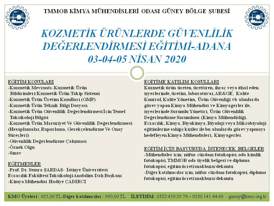 03-04-05 NİSAN 2020 KOZMETİK ÜRÜNLERDE GÜVENLİLİK DEĞERLENDİRMESİ EĞİTİMİ - ADANA