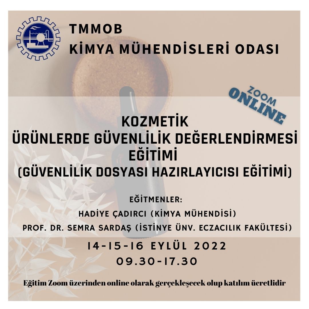 14-15-16 Eylül 2022 tarihlerinde "KOZMETİK ÜRÜNLERDE GÜVENLİLİK DEĞERLENDİRMESİ EĞİTİMİ (Güvenlilik Dosyası Hazırlayıcısı Eğitimi)" online olarak zoom programı üzerinden düzenlenecektir. Eğitim ile ilgili detaylı bilgi ve başvuru formunu aşağıda dosyalar kısmında bulabilirsiniz.