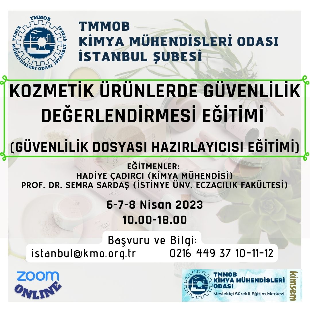 Şubemiz tarafından 6-7-8 Nisan 2023 tarihlerinde KOZMETİK ÜRÜNLERDE GÜVENLİLİK DEĞERLENDİRMESİ EĞİTİMİ (Güvenlilik Dosyası Hazırlayıcısı Eğitimi) online olarak zoom programı üzerinden düzenlenecektir. Eğitim ile ilgili detaylı bilgi aşağıda yer almakta olup eğitim başvuru formunu ekte/dosyalar kısmında bulabilirsiniz.