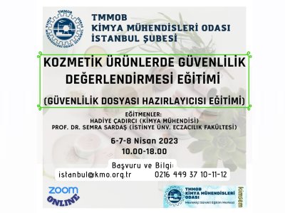 Şubemiz tarafından 6-7-8 Nisan 2023 tarihlerinde KOZMETİK ÜRÜNLERDE GÜVENLİLİK DEĞERLENDİRMESİ EĞİTİMİ (Güvenlilik Dosyası Hazırlayıcısı Eğitimi) online olarak zoom programı üzerinden düzenlenecektir. Eğitim ile ilgili detaylı bilgi aşağıda yer almakta olup eğitim başvuru formunu ekte/dosyalar kısmında bulabilirsiniz.
