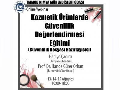 13-14-15 Ağustos 2020 tarihinde KOZMETİK ÜRÜNLERDE GÜVENLİLİK DEĞERLENDİRMESİ (Güvenlilik Dosyası Hazırlayıcısı) Online Webinar Eğitimi düzenlenecektir. Eğitim ile ilgili detaylı bilgi aşağıda yer almakta olup eğitim başvuru formunu ekte dosyalar kısmında bulabilirsiniz.