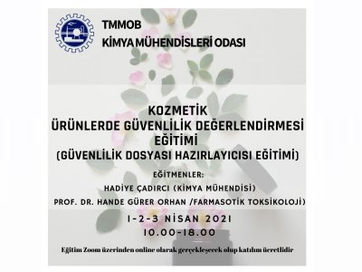 1-2-3 Nisan 2021 tarihlerinde KOZMETİK ÜRÜNLERDE GÜVENLİLİK DEĞERLENDİRMESİ EĞİTİMİ (Güvenlilik Dosyası Hazırlayıcısı Eğitimi) online olarak zoom programı üzerinden düzenlenecektir. Eğitim ile ilgili detaylı bilgi aşağıda yer almakta olup eğitim başvuru formunu ekte dosyalar kısmında bulabilirsiniz.