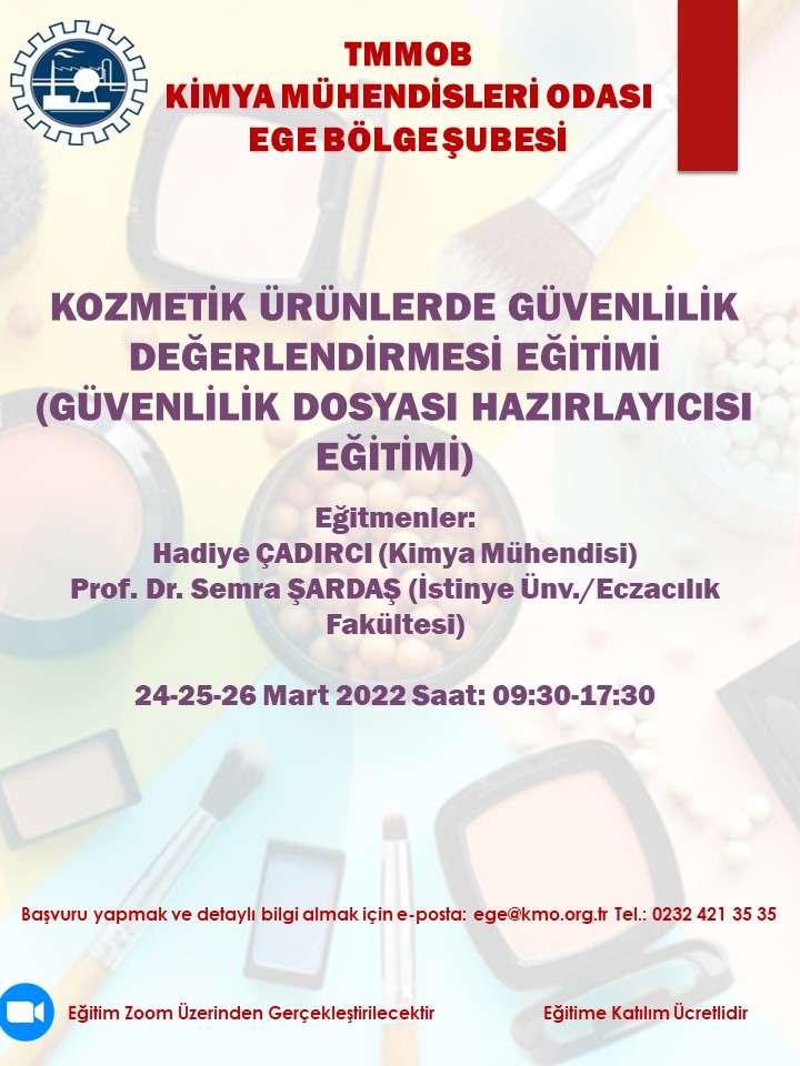 24-25-26 Mart 2022 tarihlerinde KOZMETİK ÜRÜNLERDE GÜVENLİLİK DEĞERLENDİRMESİ EĞİTİMİ (Güvenlilik Dosyası Hazırlayıcısı Eğitimi) online olarak zoom programı üzerinden düzenlenecektir. Eğitim ile ilgili detaylı bilgi aşağıda yer almakta olup eğitim başvuru formunu ekte bulabilirsiniz. Eğitime katılmak isteyenlerin, başvuru formunu doldurarak ege@kmo.org.tr e-posta adresine göndermelerini rica ederiz.
