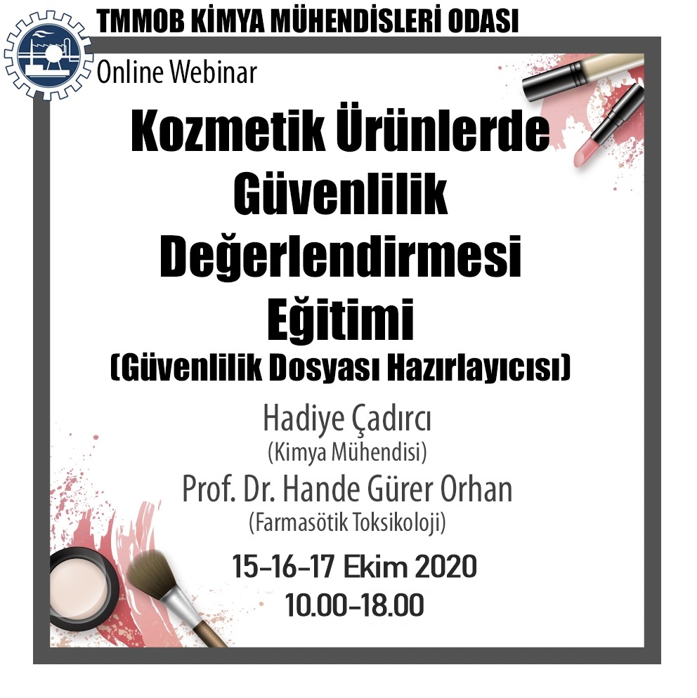 15-16-17 Ekim 2020 tarihlerinde KOZMETİK ÜRÜNLERDE GÜVENLİLİK DEĞERLENDİRMESİ (Güvenlilik Dosyası Hazırlayıcısı Eğitimi) online webinar eğitimi düzenlenecektir.