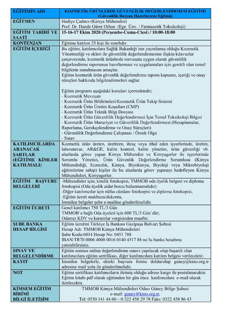 15-16-17 Ekim 2020 tarihlerinde KOZMETİK ÜRÜNLERDE GÜVENLİLİK DEĞERLENDİRMESİ (Güvenlilik Dosyası Hazırlayıcısı Eğitimi) online webinar eğitimi düzenlenecektir. Eğitim ile ilgili detaylı bilgi aşağıda yer almakta olup eğitim başvuru formunu ekte dosyalar kısmında bulabilirsiniz. Eğitime katılmak isteyenlerin, başvuru formunu doldurarak guney@kmo.org.tr e-mail adresine göndermelerini rica ederiz.