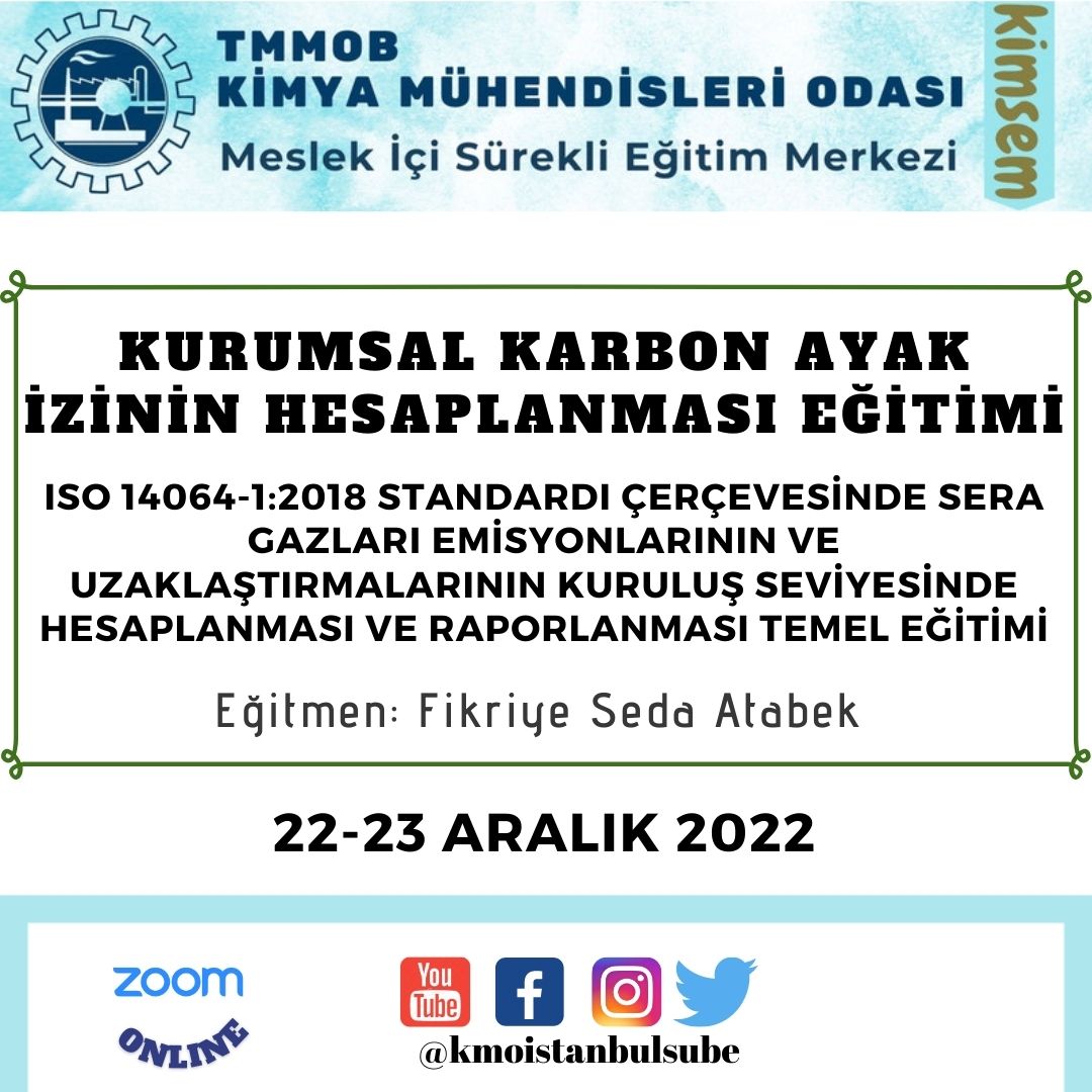 Odamız tarafından 22-23 Aralık 2022 tarihlerinde saat 10.00-18.00 saatleri arasında `Kurumsal Karbon Ayak İzinin Hesaplanması: ISO 14064-1:2018 Standardı Çerçevesinde Sera Gazları Emisyonlarının ve Uzaklaştırmalarının Kuruluş Seviyesinde Hesaplanması ve Raporlanması Temel Eğitimi` zoom programı üzerinden online olarak düzenlenecektir.
