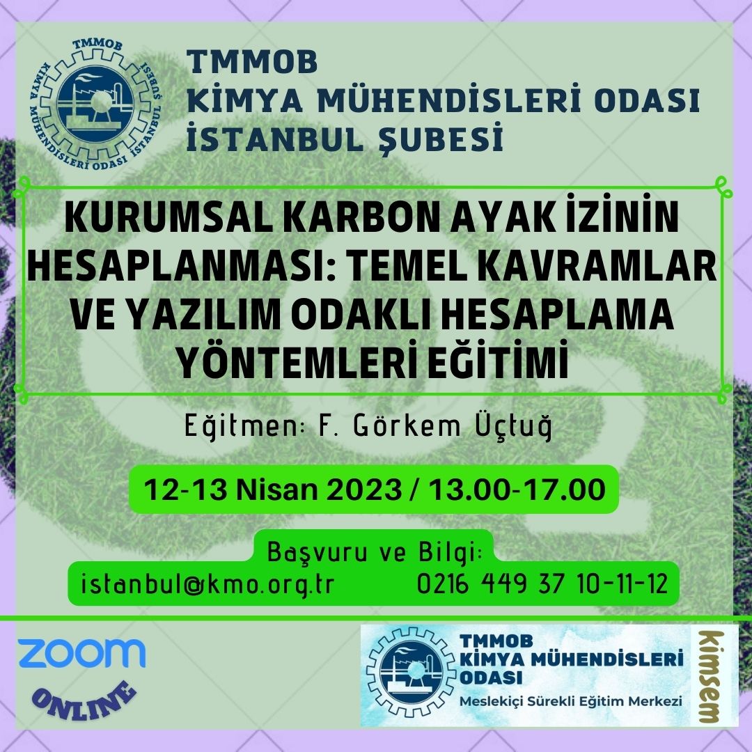Odamız tarafından 12-13 Nisan 2023 tarihlerinde 13.00-17.00 saatleri arasında `Kurumsal Karbon Ayak İzinin Hesaplanması: Temel Kavramlar ve Yazılım Odaklı Hesaplama Yöntemleri Eğitimi` zoom programı üzerinden online olarak düzenlenecektir.