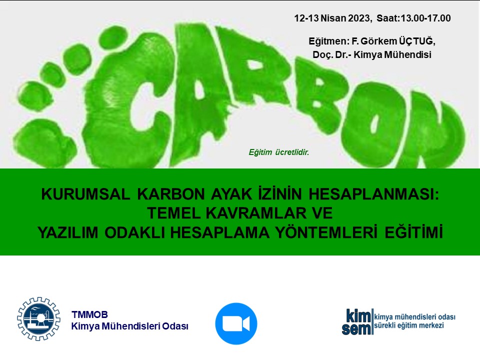 Kimya Mühendisleri Odası tarafından 12-13 Nisan 2023 tarihlerinde 13.00-17.00 saatleri arasında "Kurumsal Karbon Ayak İzinin Hesaplanması: Temel Kavramlar ve Yazılım Odaklı Hesaplama Yöntemleri Eğitimi" zoom programı üzerinden online olarak düzenlenecektir.