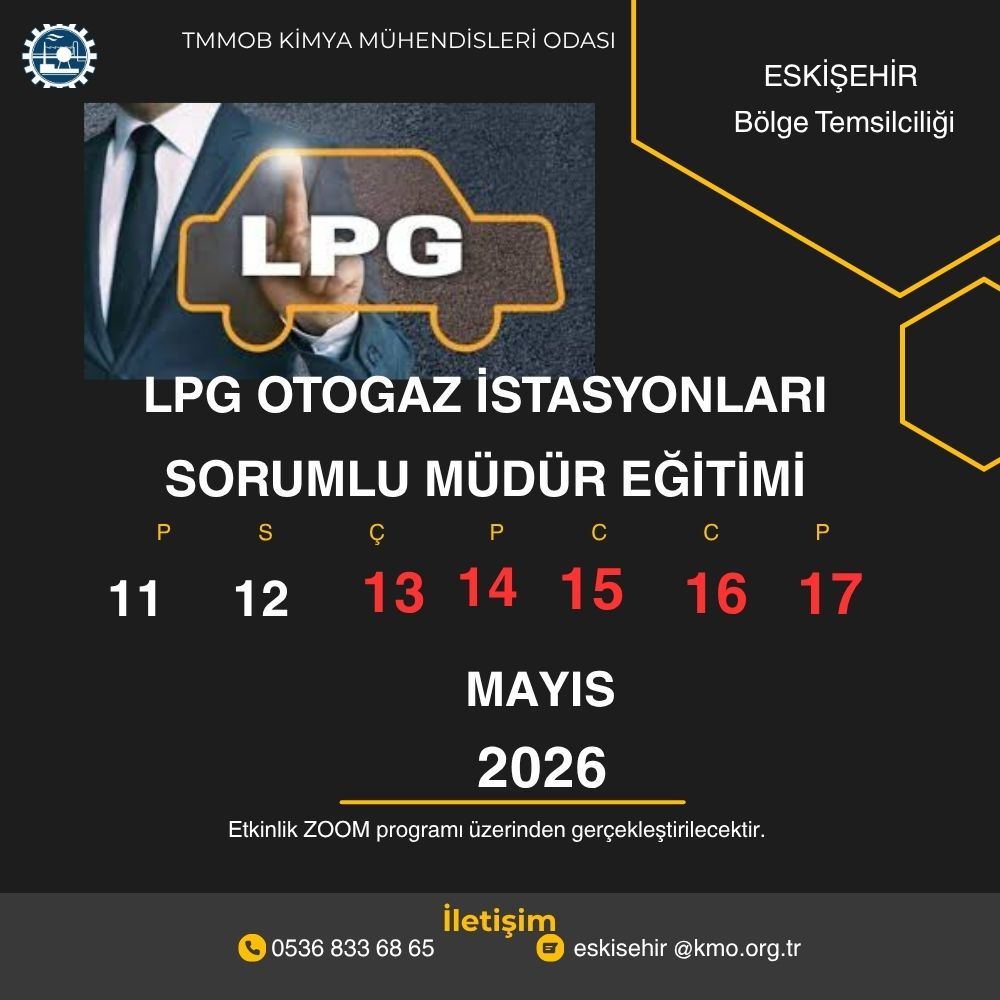 TMMOB Kimya Mühendisleri Odası Eskişehir Bölge Temsilciliği 15-16-17 Mayıs 2026 OTOGAZ İSTASYONLARINDA SORUMLU MÜDÜRLÜK EĞİTİMİ* (UZAKTAN EĞİTİM)