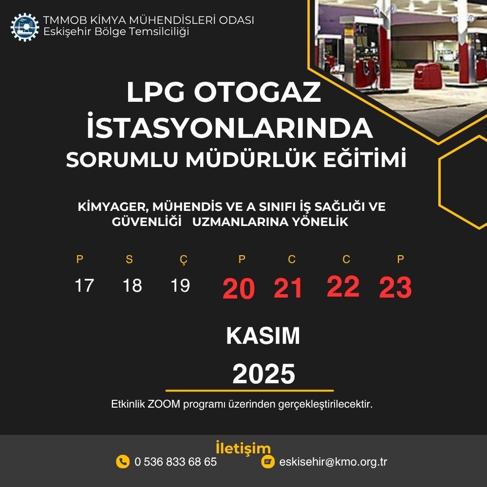 TMMOB Kimya Mühendisleri Odası Eskişehir Bölge Temsilciliği 20-24 Kasım 2025 OTOGAZ İSTASYONLARINDA SORUMLU MÜDÜRLÜK EĞİTİMİ* (UZAKTAN EĞİTİM)