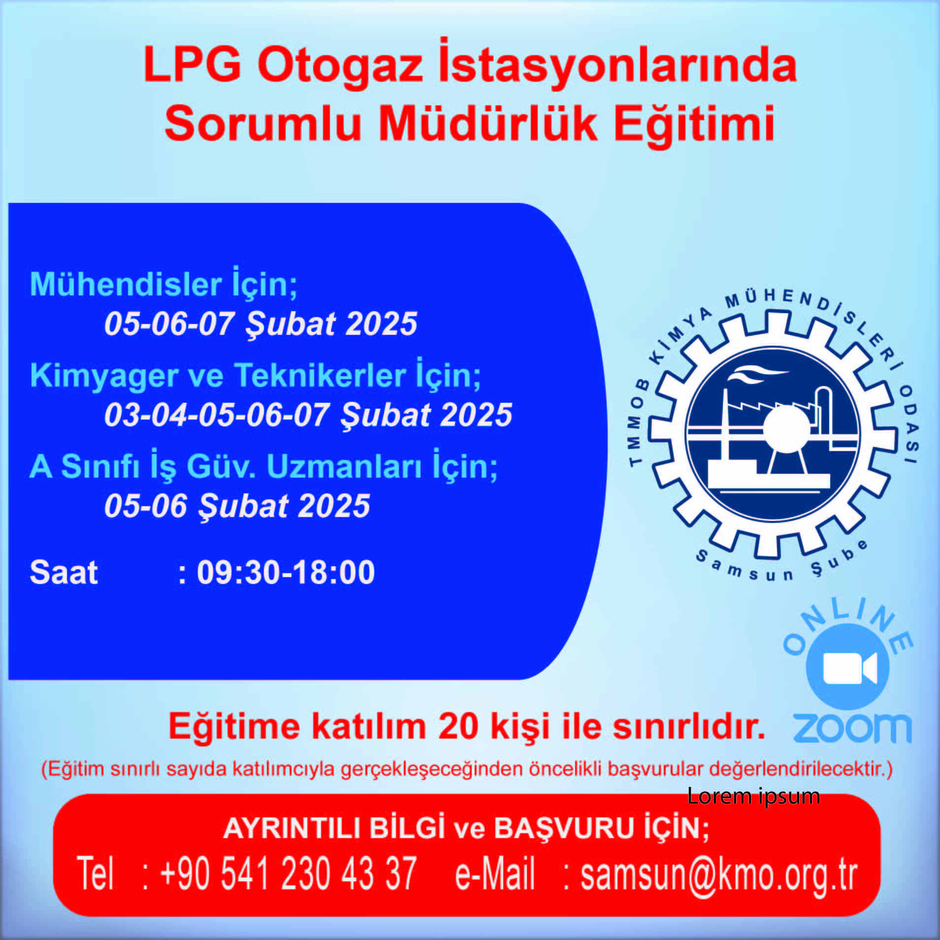 TMMOB Kimya Mühendisleri Odası Samsun Şube tarafından 03-04-05-06-07 Şubat 2025 tarihleri arasında, "LPG Otogaz İstasyonlarında Sorumlu Müdürlük Eğitimi" ZOOM programı üzerinden online olarak düzenlenecektir. Eğitim katılım süreleri aşağıdaki gibidir: