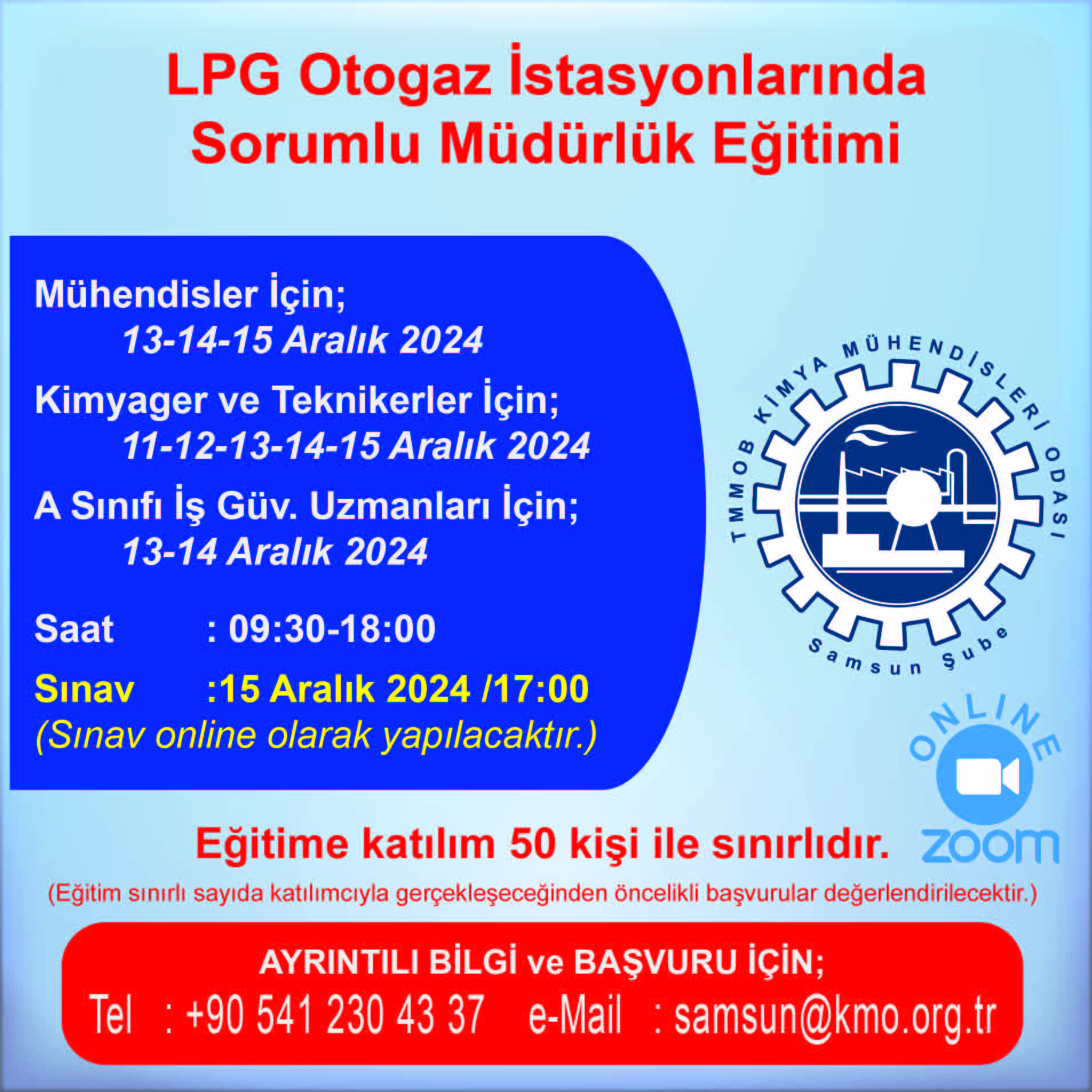 TMMOB Kimya Mühendisleri Odası Samsun Şube tarafından 11-12-13-14-15 Aralık 2024 tarihleri arasında, "LPG Otogaz İstasyonlarında Sorumlu Müdürlük Eğitimi" ZOOM programı üzerinden online olarak düzenlenecektir. Eğitim katılım süreleri aşağıdaki gibidir: