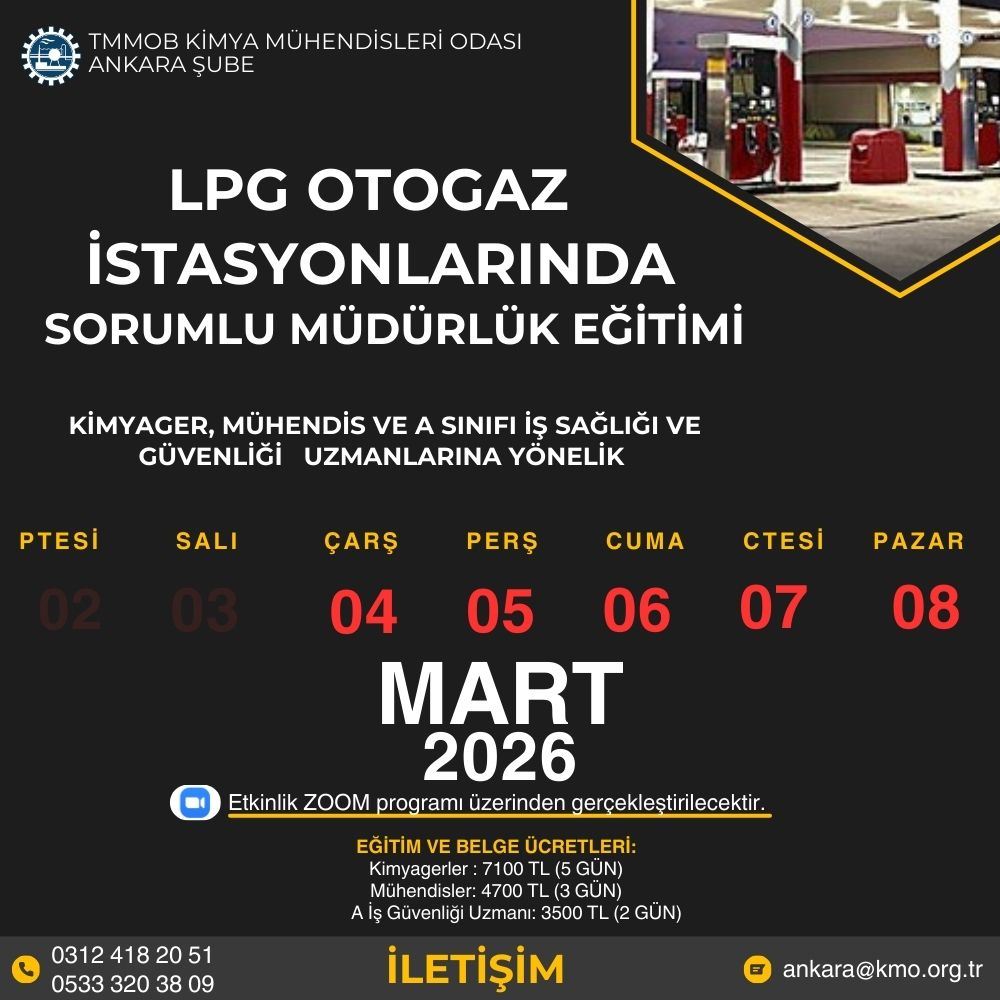 TMMOB Kimya Mühendisleri Odası Ankara Şubesi tarafından 4-5-6-7-8 MART 2026 TARİHLERİNDE OTOGAZ İSTASYONLARINDA SORUMLU MÜDÜRLÜK EĞİTİMİ VERİLECEKTİR. (UZAKTAN EĞİTİM)