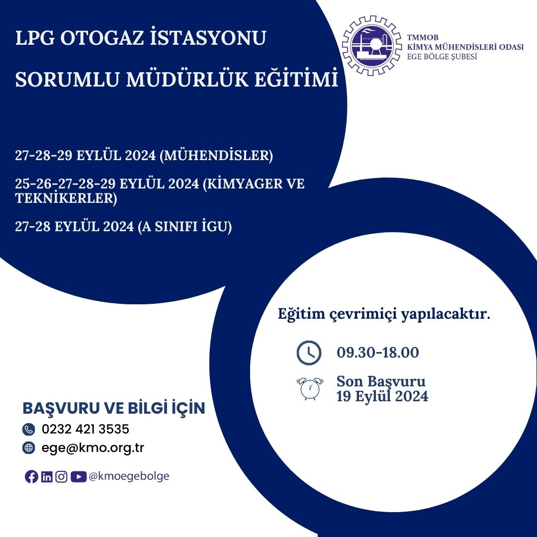 | EĞİTİM TARİHİ VE SAATİ | 27-28-29 Eylül 2024 (Mühendisler) 25-26-27-28-29 Eylül 2024 (Kimyager ve Teknikerler) 27-28 Eylül 2024 (A Sınıfı İGU) 09:30-18:00 (Devam zorunluluğu vardır) Sınav 29 Eylül 2024 Saat 17:00 |