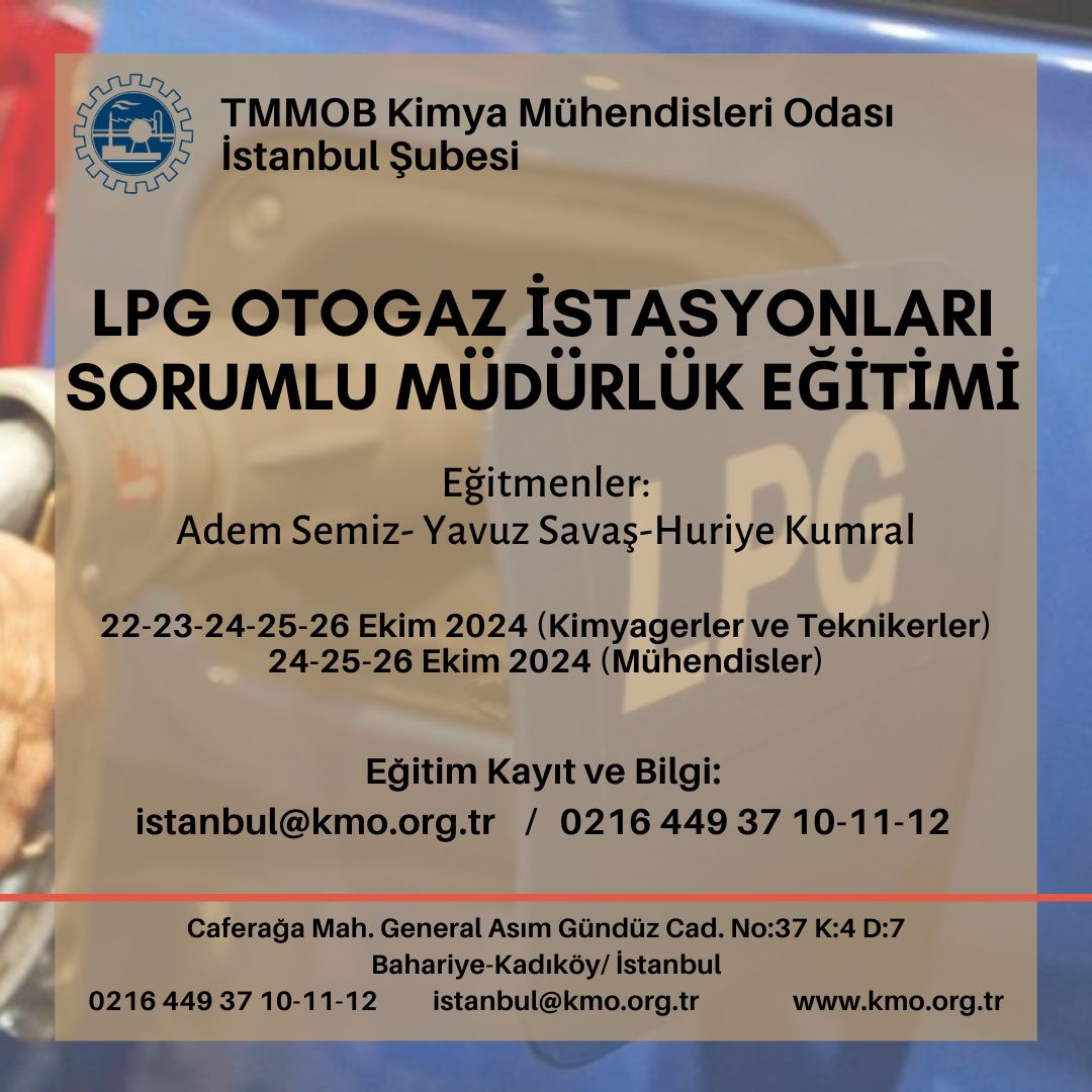 Şubemiz tarafından 22-23-24-25-26 Ekim 2024 tarihlerinde Kimyagerler ve teknikerlere yönelik, 24-25-26 Ekim 2024 tarihlerinde de Mühendislere yönelik LPG Otogaz İstasyonu Sorumlu Müdürlük Eğitimi Şubemiz eğitim salonunda yüz yüze düzenlenecektir. Eğitim ile ilgili detaylı bilgiyi ve eğitim başvuru formunu aşağıda bulabilirsiniz.